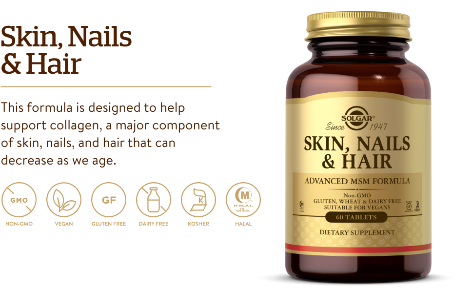 مغذيات للبشرة والأظافر والشعر؛ لا يمكن إيصال العديد من العناصر الغذائية إلى الجسم خارجيًا؛ يوفر Solgar Skin, Nails & Hair جرعة يومية من الزنك (136% DV)، وفيتامين C (133% DV)، والنحاس، وميثيل سلفونيل الميثان، والمواد المغذية الرئيسية الأخرى التي تدعم الكولاجين.