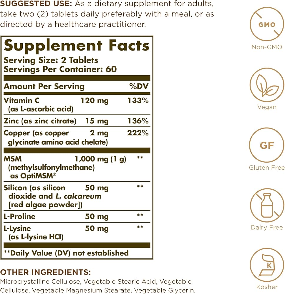 الزنك وMSM؛ الزنك هو معدن نادر يلعب دورًا في تخليق الكولاجين في أنسجة العظام. MSM (ميثيل سلفونيل ميثان) هو مصدر للكبريت الطبيعي المتوفر بيولوجيًا، وهو معدن يدعم الأنسجة الضامة وغضروف المفاصل الصحي.