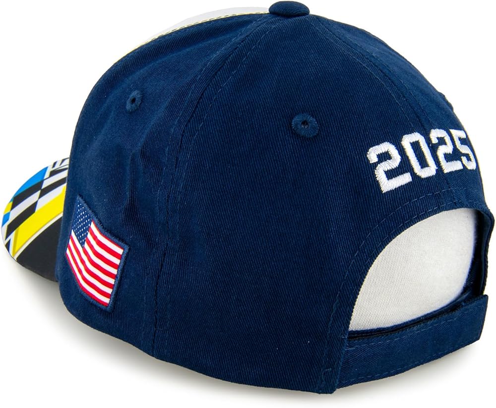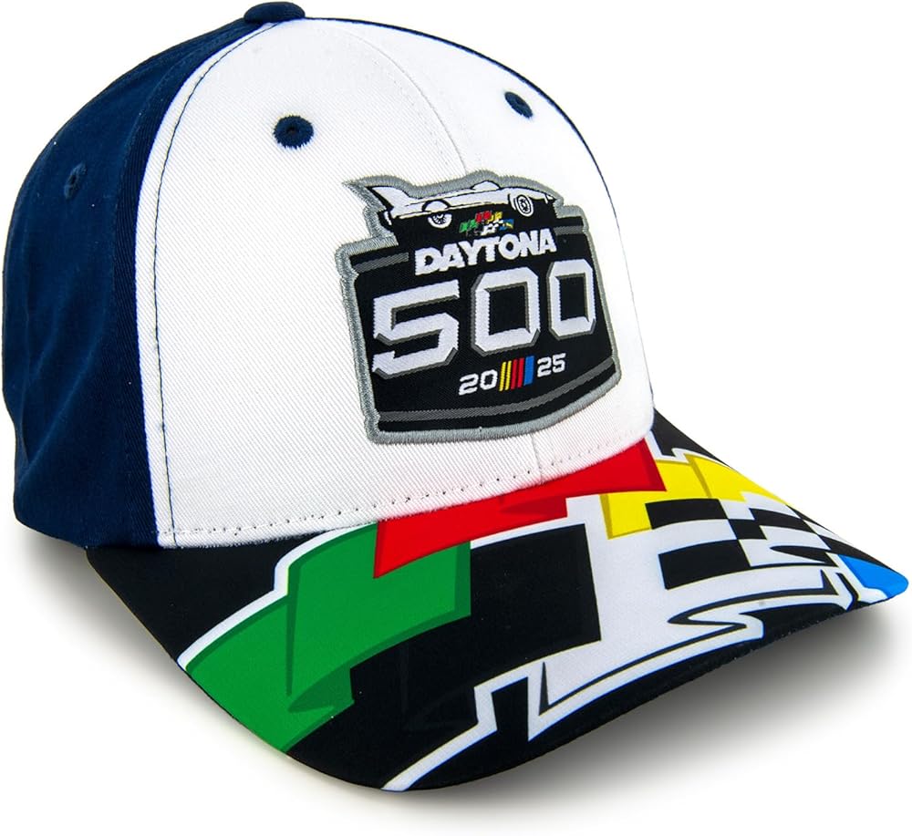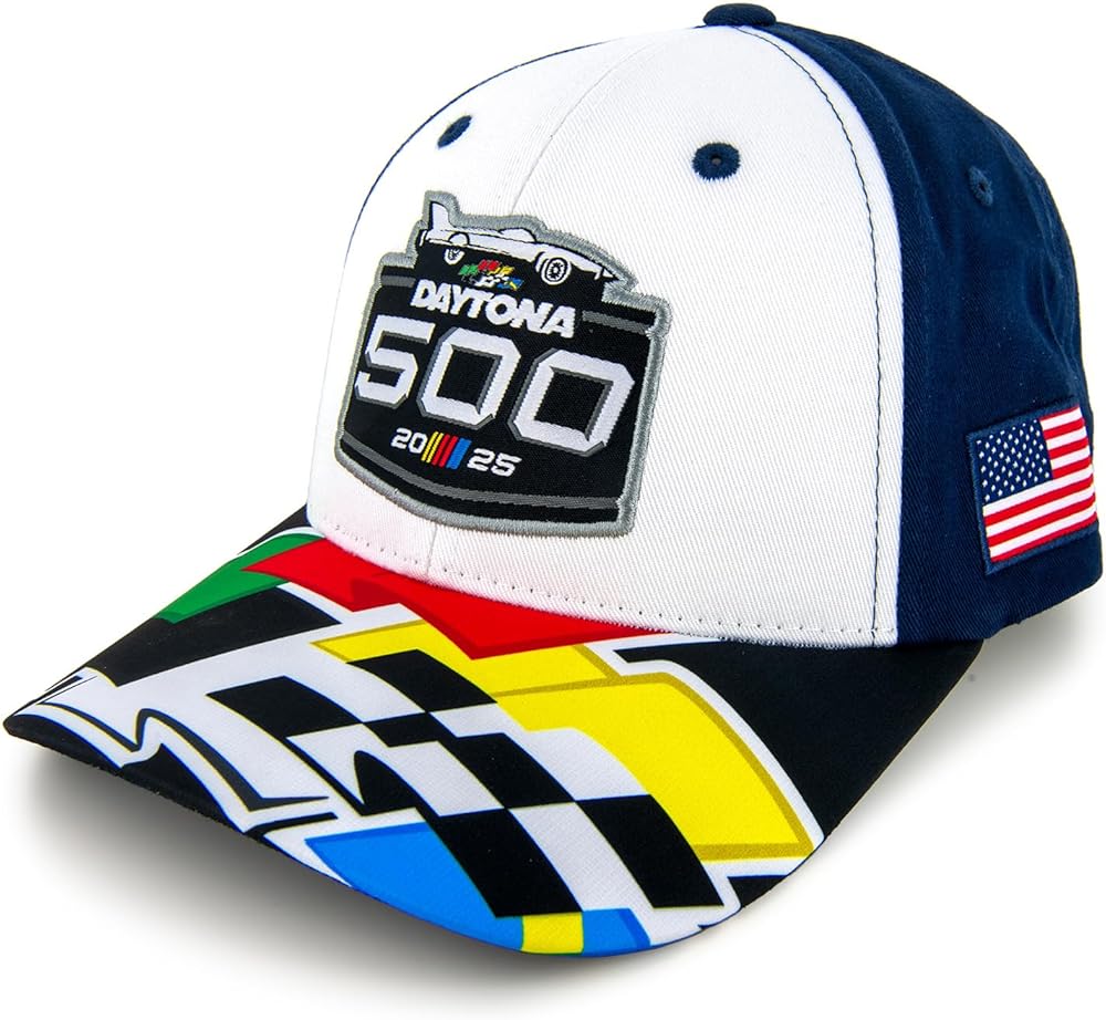 This officially licensed NASCAR 2025 Daytona event hat features the Daytona 500 logo on the crown, an abstract combination of racing flags on the bill, American flag on the side, and the year on the back