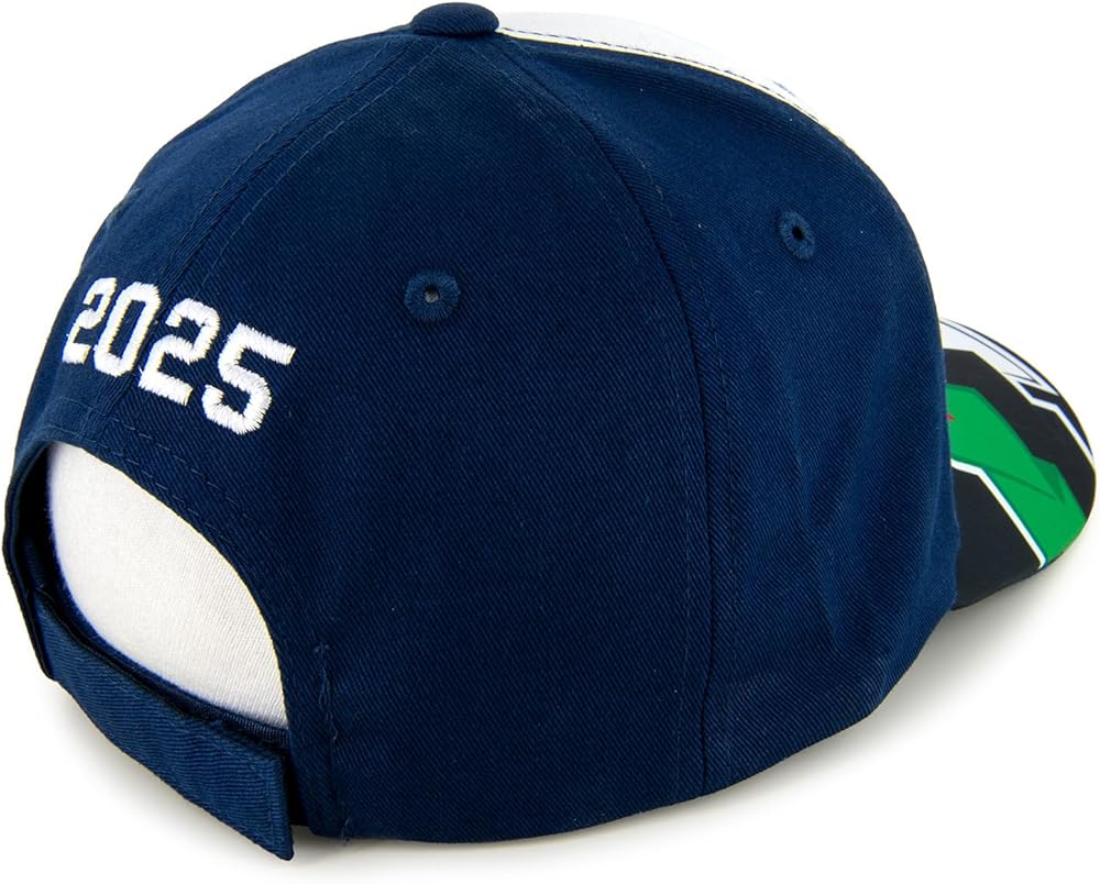 This officially licensed NASCAR 2025 Daytona event hat features the Daytona 500 logo on the crown, an abstract combination of racing flags on the bill, American flag on the side, and the year on the back. The hook loop closure adjusts to fit most adults. 100% cotton construction.