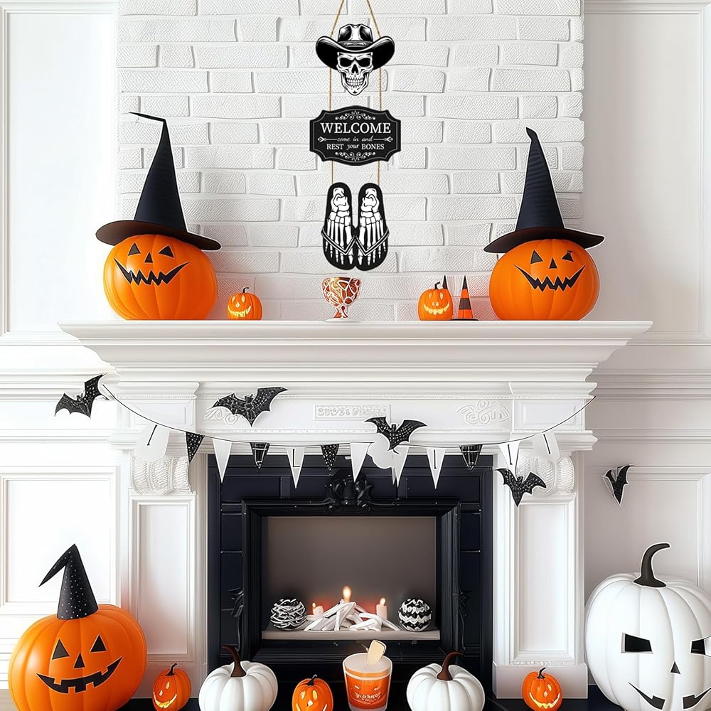 ديكورات باب الهالوين، هيكل عظمي للهالوين، ديكور جداري، علامة باب جمجمة خشبية للهالوين، علامة ترحيب للهالوين، شماعة باب للهالوين، إكليل باب للهالوين لحفلة الشرفة، ديكور منزلي داخلي مخيف للهالوين