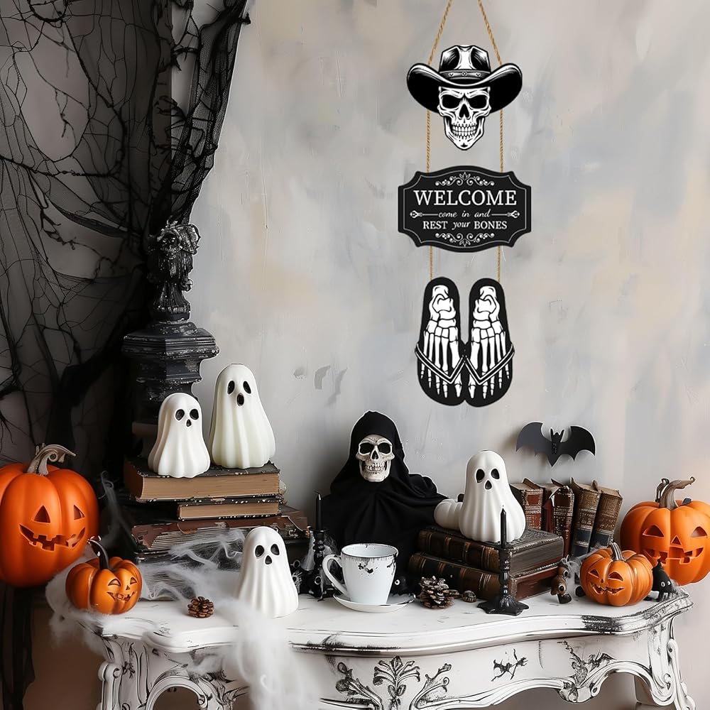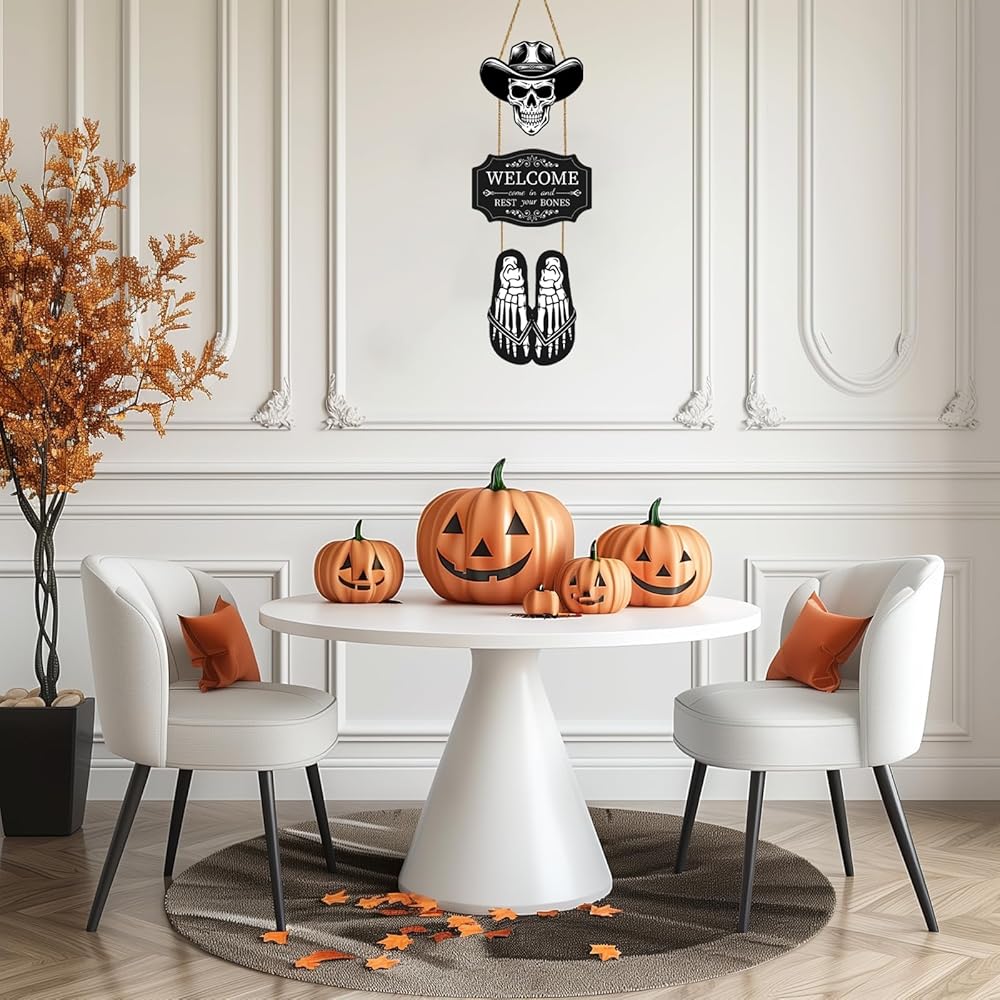 You'll get: You'll receive a Halloween skeleton front door decoration, classic skull pattern, a "welcome come in and rest your bones" sign, full of Halloween atmosphere, perfect for decorating your home on Halloween and creating a strong Halloween atmosphere