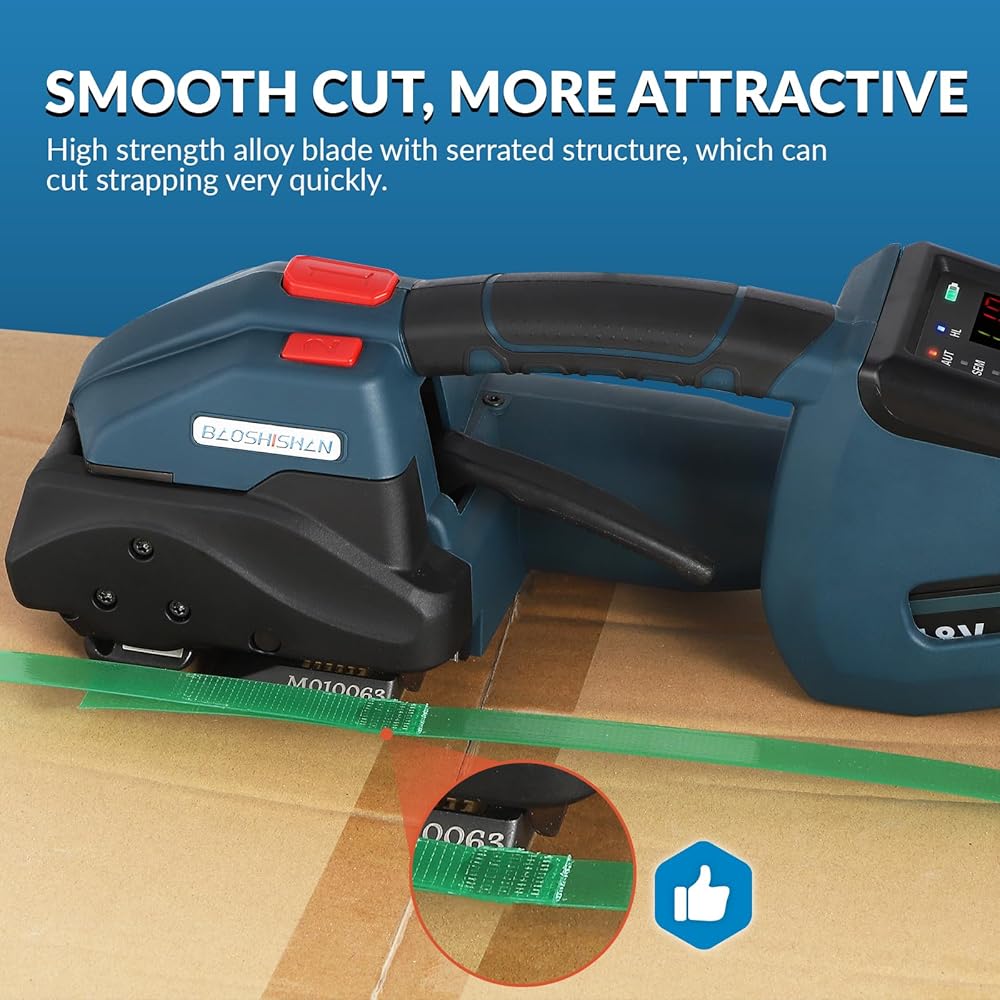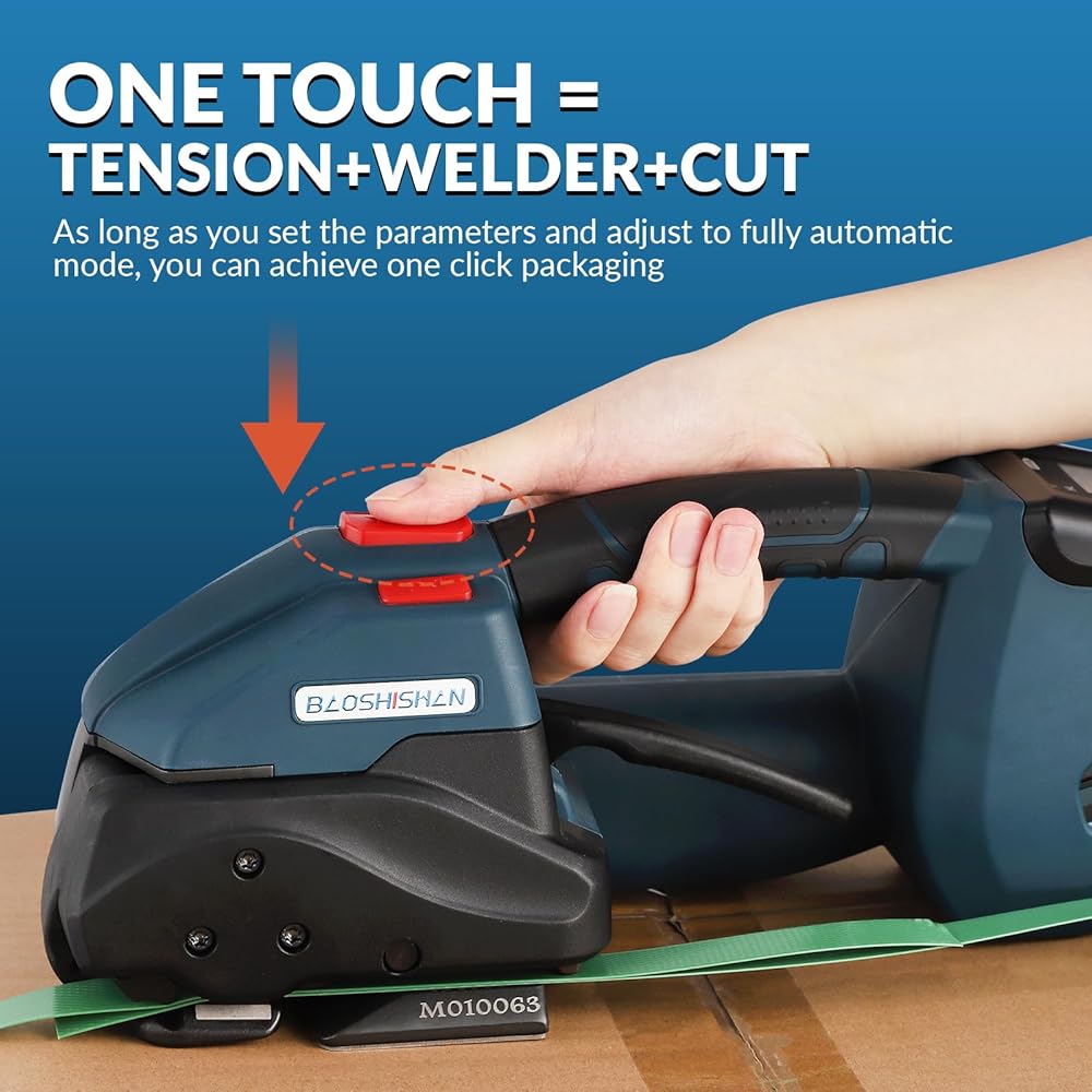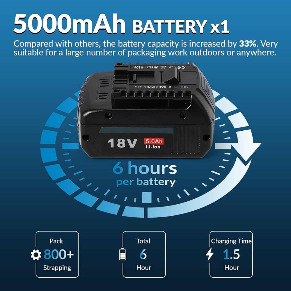 • بطارية 5000 مللي أمبير - بالمقارنة مع الأجهزة الأخرى، تزيد سعة البطارية بنسبة 33%. يتم شحنه لمدة 90 دقيقة فقط، ثم يمكنه العمل في الهواء الطلق لمدة 6 ساعات ويمكنه إكمال أكثر من 800 شريط. مناسب جدًا لعدد كبير من أعمال التغليف في الهواء الطلق أو في أي مكان.