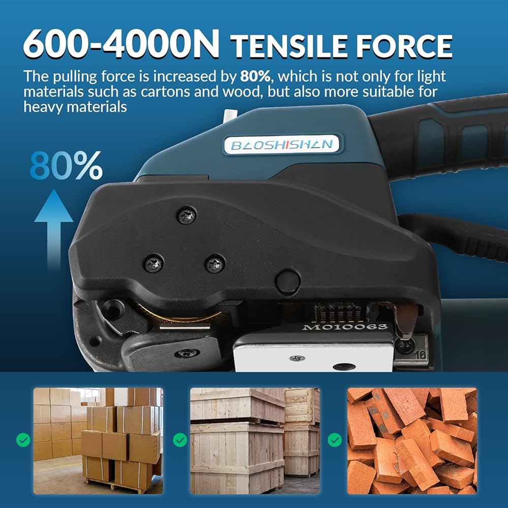 • قوة الشد 600-4000N - يتم زيادة قوة السحب بنسبة 80%، وهي ليست فقط للمواد الخفيفة مثل الكرتون والخشب، ولكنها أيضًا أكثر ملاءمة للمواد الثقيلة مثل الطوب والفولاذ والصناديق الخشبية السميكة. بالإضافة إلى ذلك، فإن آلة الربط الكهربائية لدينا مزودة بمحرك بدون فرش، مع ضوضاء منخفضة، وطاقة قوية وليس من السهل أن تسخن أو تتلف.