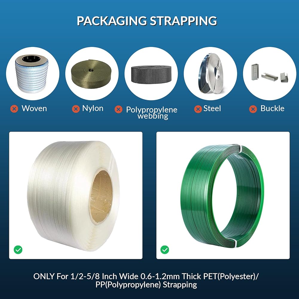 • لكل من أشرطة البولي بروبيلين والحيوانات الأليفة - من خلال استبدال الزنبرك وملحقات التشغيل، يمكن تطبيقه على عرض 1/2 بوصة إلى 5/8 بوصة، وسمك 0.024 بوصة إلى 0.047 بوصة من PET (البوليستر)، PP (البولي بروبيلين).