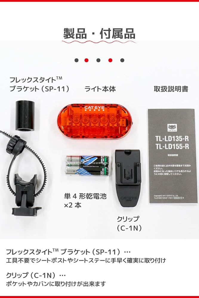 Five bright LEDs deliver great brightness with impressive runtime. The Omni 5 rear light provides 360 degrees of visibility and New Omni Directional Technology increases safety while three flashing modes – rapid, flashing and constant, let you select the right level of visibility. With two AAA batteries, the Omni 5 will run up to 120 hours. The simple, tool-free FlexTight bracket and included clothing clip allow you to easily attach the Omni 5 anywhere you'd like. Specifications Dimension: 36.0 X 75.0 X 21.9mm Weight: 41.8 grams (light unit and battery) Light source: Red LED X5 Battery: AAA alkaline battery X2 Runtime: Approx 60hrs in constant, 90hrs in flashing, and 120hrs in rapid mode Mount size: dia.12.0 to 32.0mm (FlexTight SP-11) Other: Clothing clip included *The factory-loaded battery life might be shorter than the specification above. *Design and specifications are subject to change without notice. Manual http://202.215.251.86/images/manual/TL-LD135-R_155-R_HP_ENG_v1.pdf