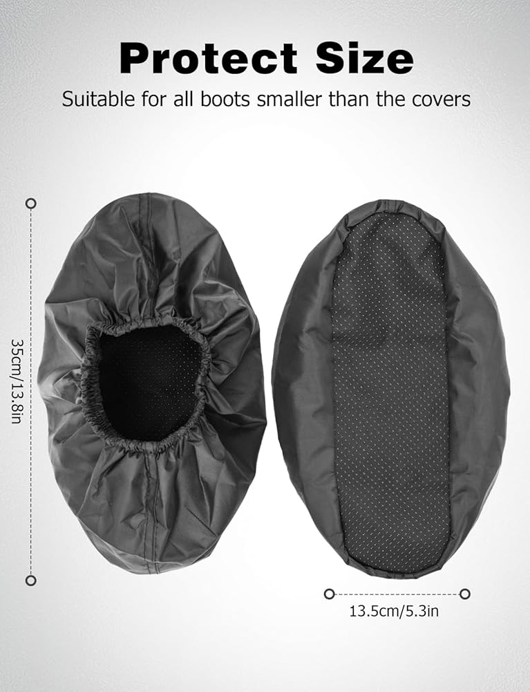 About Sizes: As the size of boots on the market cannot be completely uniform, we suggest that you choose based on the length and width of the boots. The size of the shoe cover is 35x13.5cm (13.8x5.3 inch). After our testing, it is recommended that you use it with confidence if your boots are smaller than this size.
