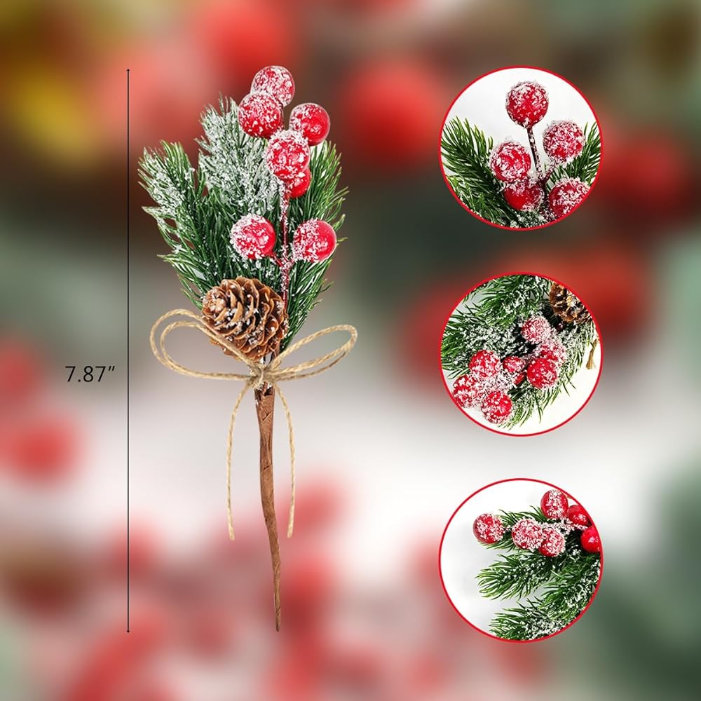 Size Information: Each artificial pine branches is about 7.87" tall, with red berries, snowy glittery pinecones, and pine leaves. Stems attached to Christmas flowers are strong but can be bendable for most of your crafting needs