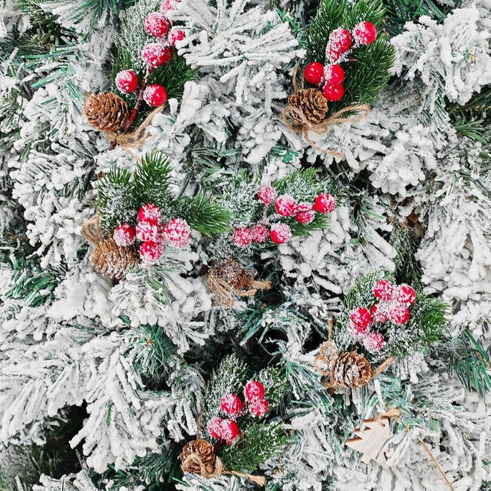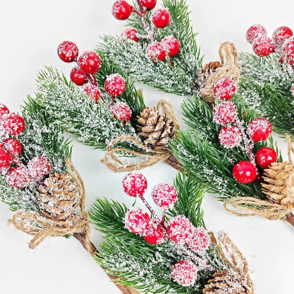 Features: These Christmas artificial picks stems have snow dusted leaves, red holly berries and a pine cone flocked with snow. Great for gift embellishments or holiday craft projects. nice for gift wrapping or holiday craft projects