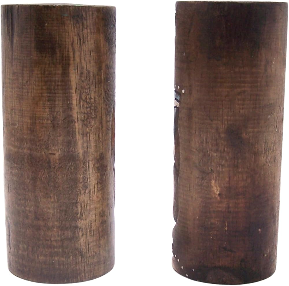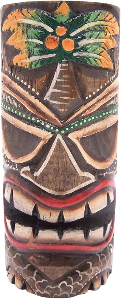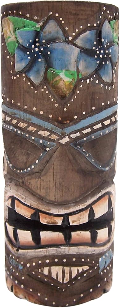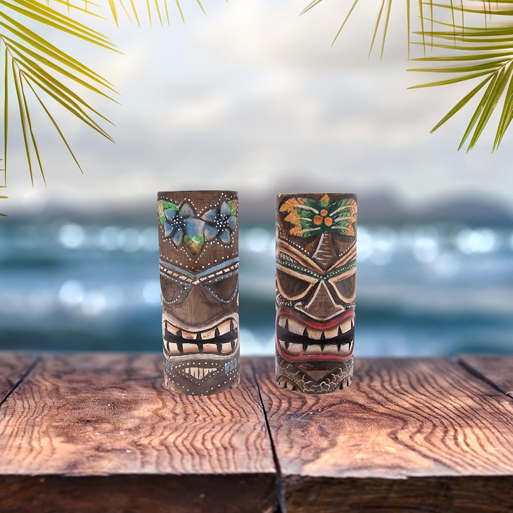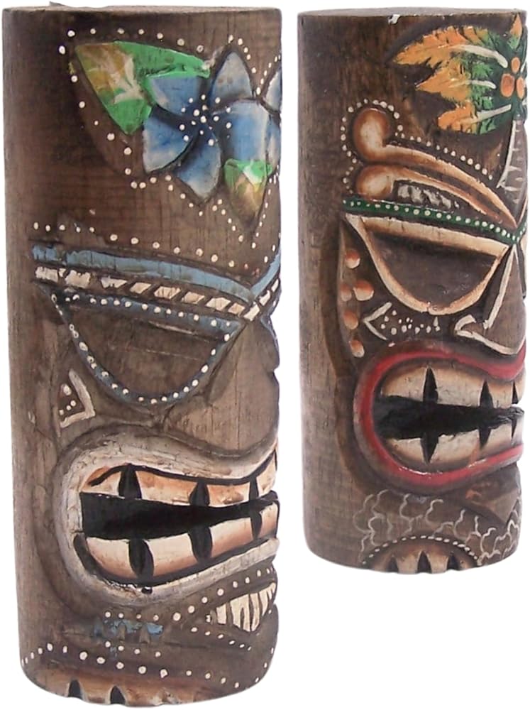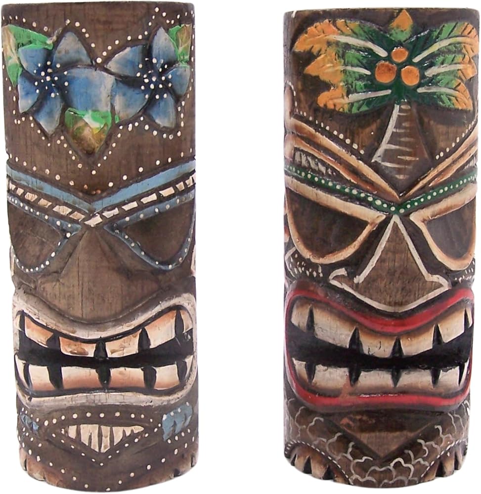 - مجموعة من تمثالين تيكي يتميز كل منهما بقناع تيكي ملون ملون - أحدهما بتصميم زهرة والآخر بتصميم شجرة نخيل