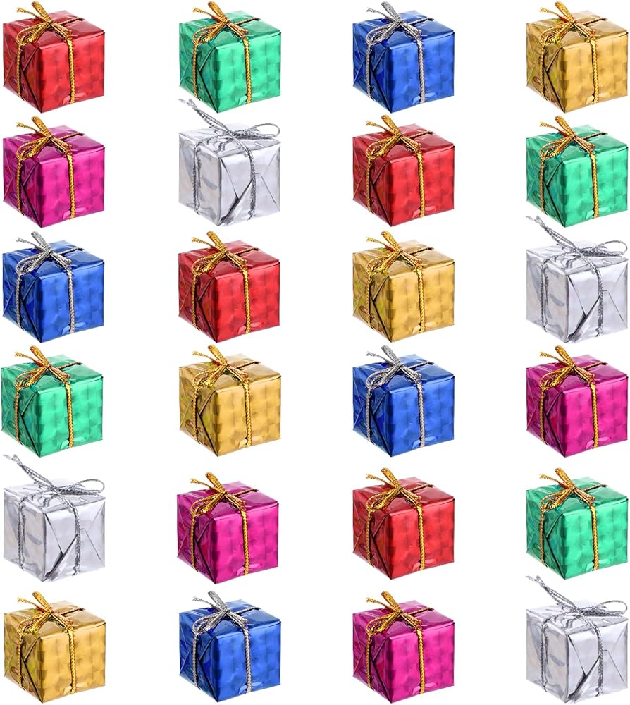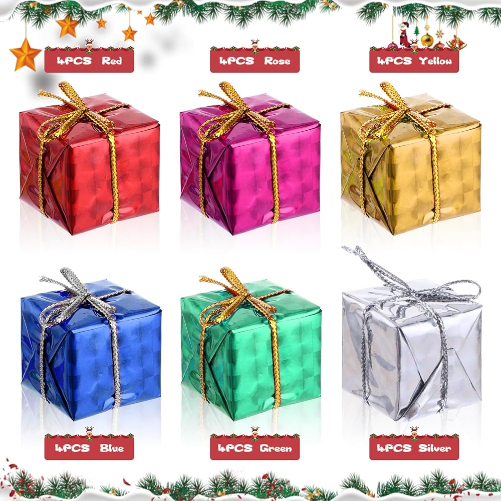 Christmas Tree Hanging Ornaments: You will receive 24pcs Christmas small gift boxes of ornaments in different colors, sizes of about 2.5x2.5x2.5 cm/0.98x0.98x0.98 inches, the quantity and style are enough for Christmas tree decoration and daily use. Creating a warm and cheerful festival atmosphere for you.