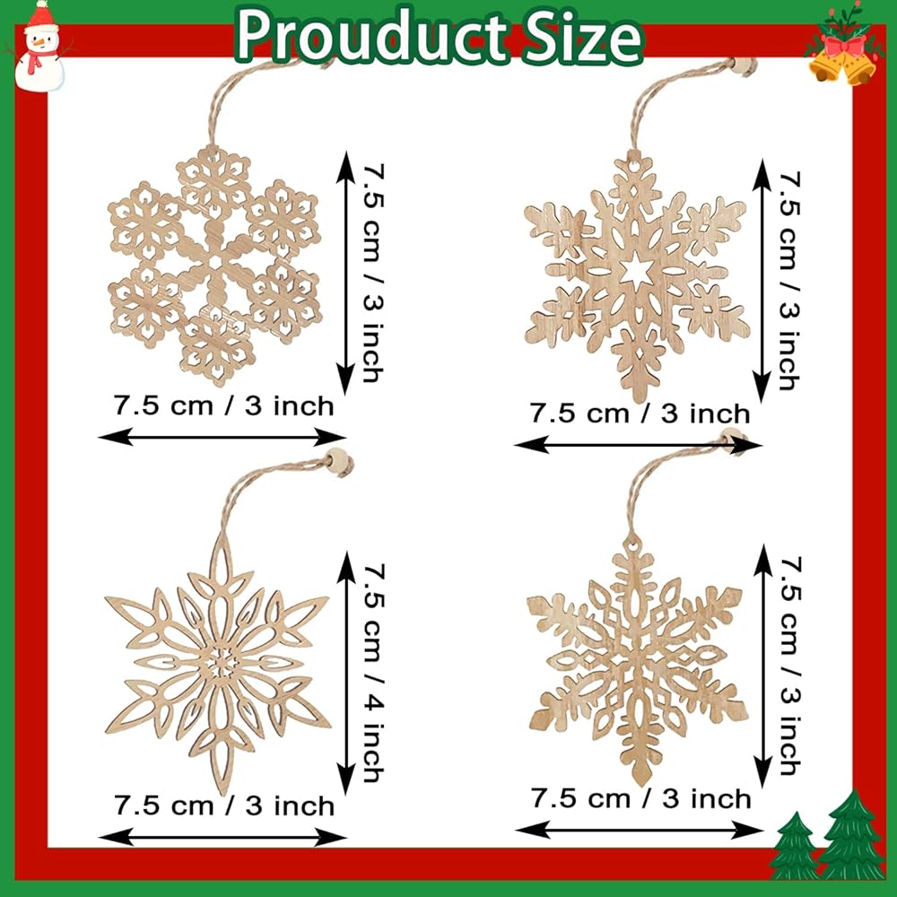 12 قطعة من زخارف ندفات الثلج الخشبية مقاس 7.62 سم من خشب الكريسماس، زينة معلقة على شكل ندفات الثلج مع خيوط، قطع مجمعة لمزرعة ريفية غير مكتملة لديكور الحرف اليدوية لشجرة عيد الميلاد