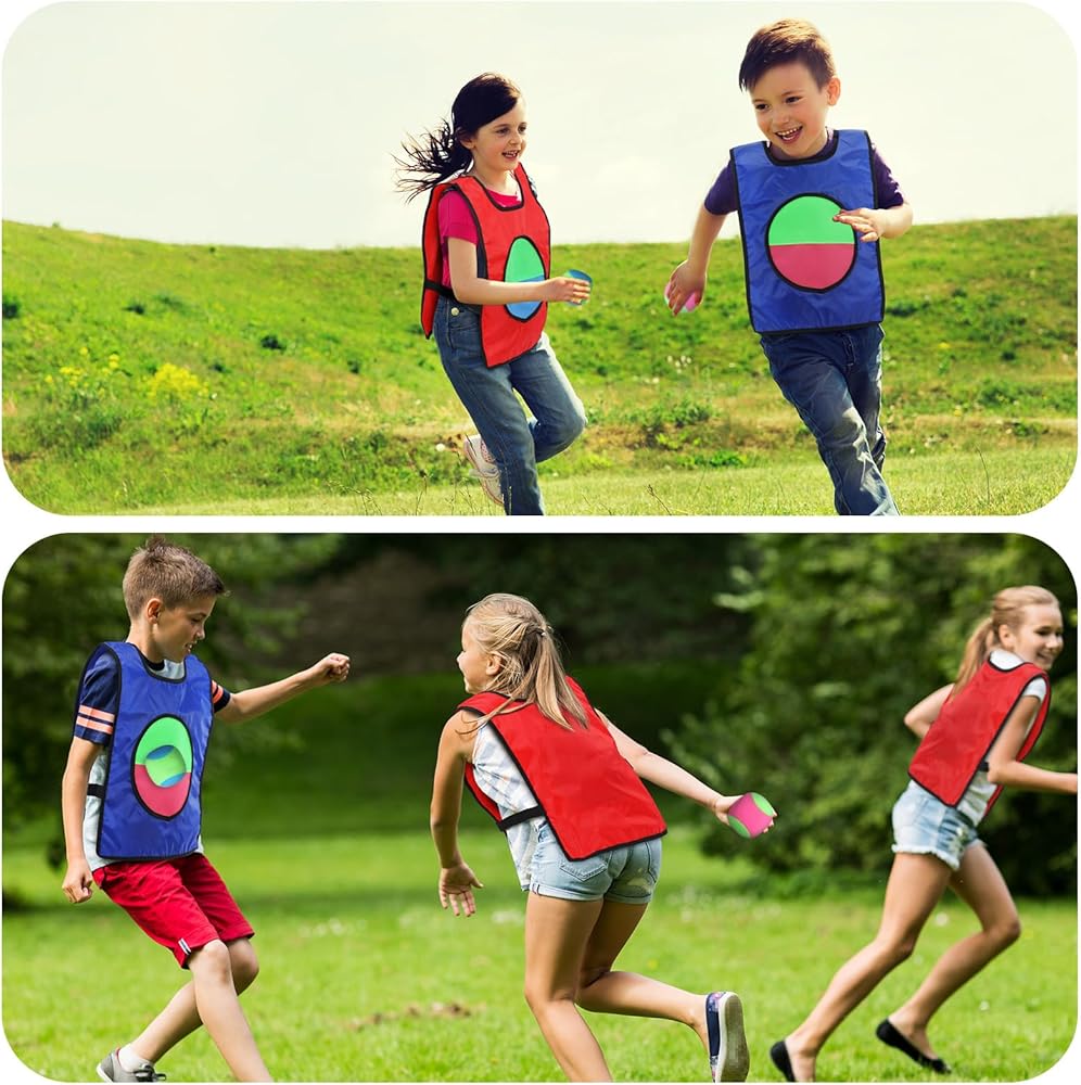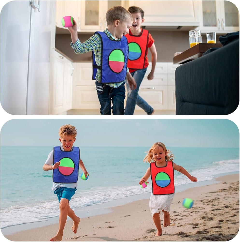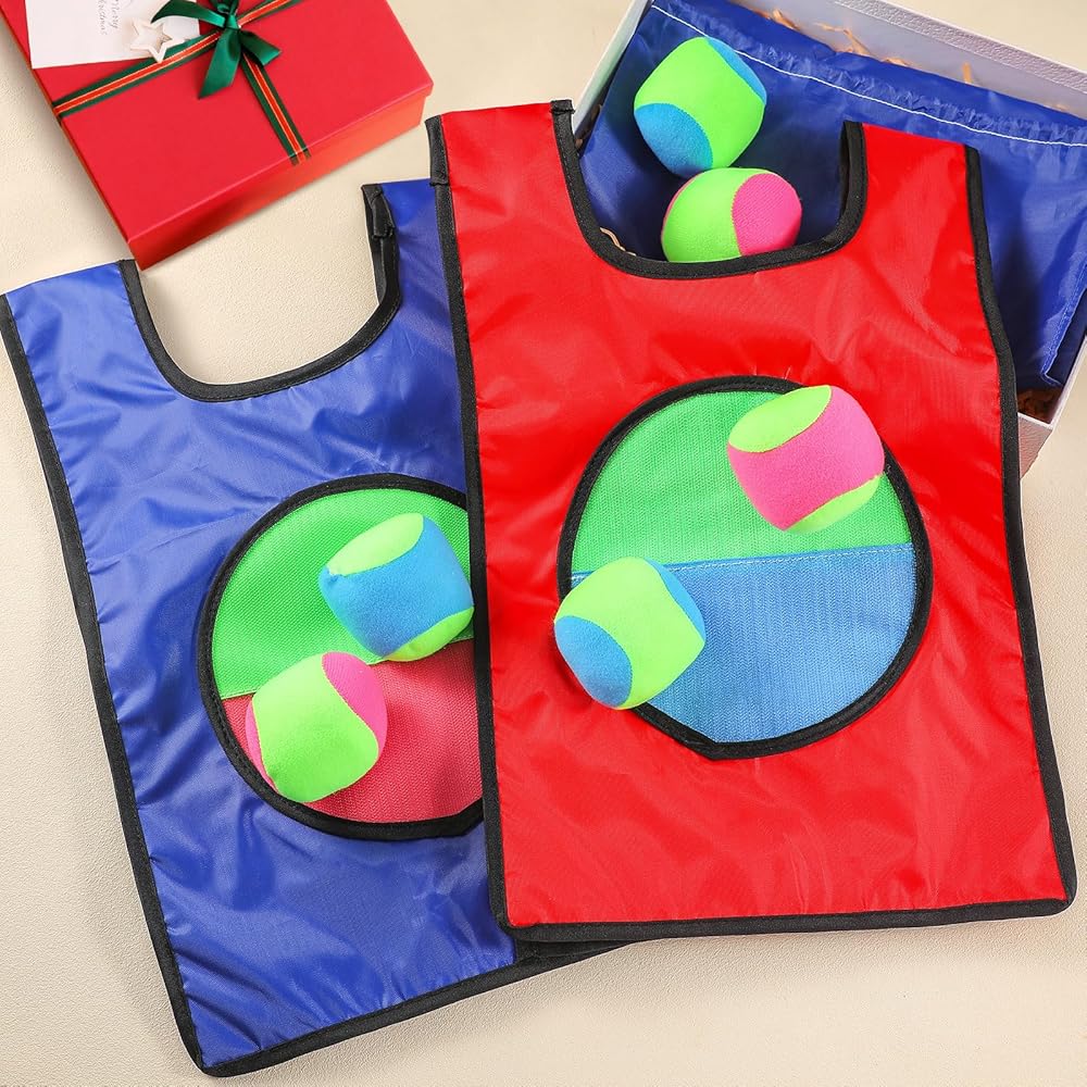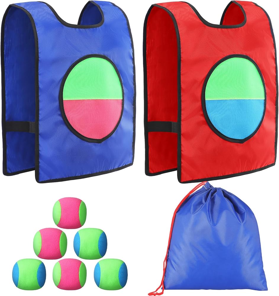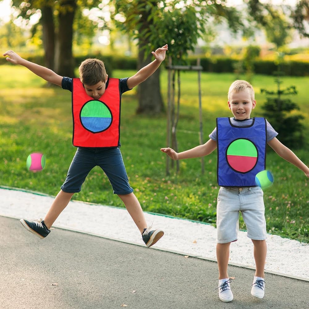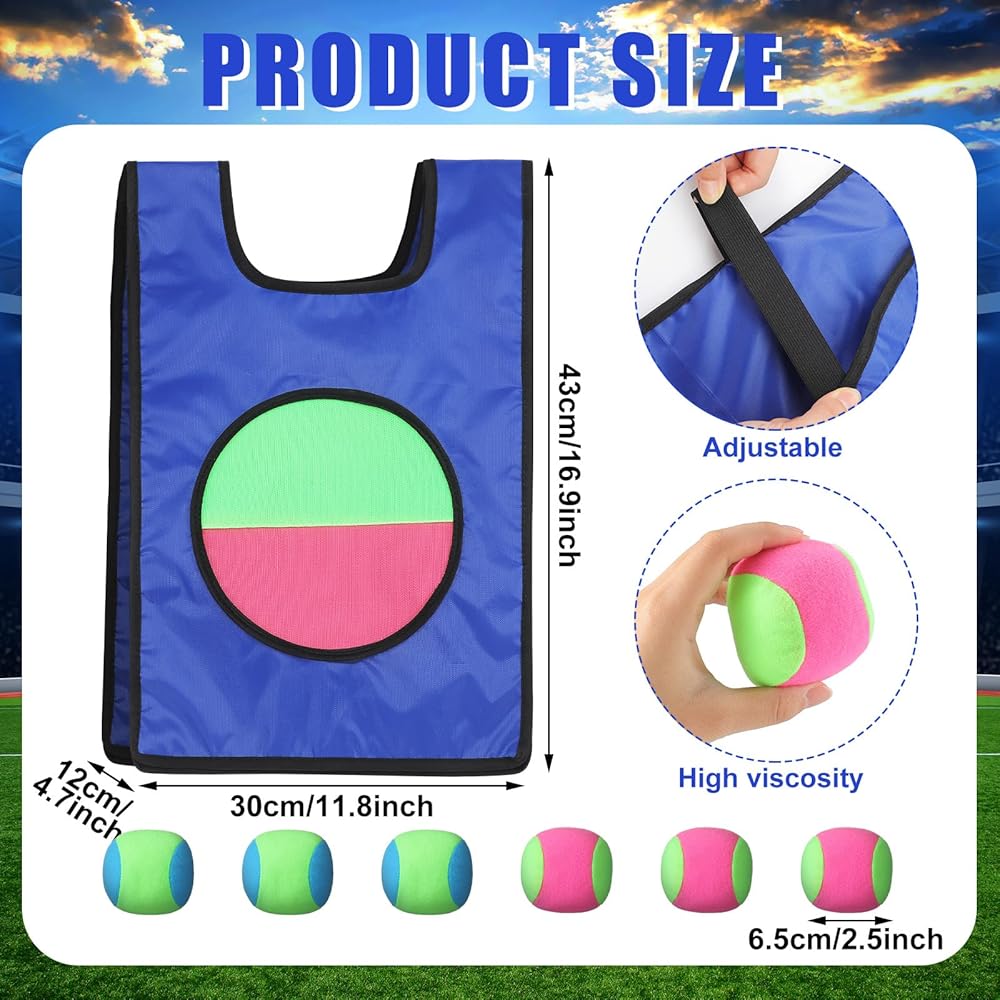 Engage in an exciting throw and catch game set that encourages social interaction and physical fitness. Each vest features a front surface with self adhesive material, designing an interactive catch ball game where you simply throw the ball, aiming to stick it onto the vest. Ideal for any outdoor or indoor setting, it's time to transform your regular gatherings and parties into fun and energetic lawn party games.