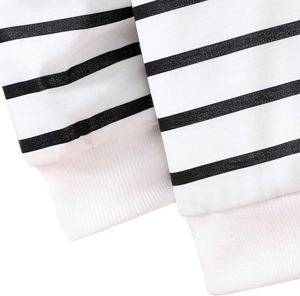 - تصميم لطيف وأنيق: يتميز بطباعة مخططة باللونين الأسود والأبيض وسويت شيرت برقبة دائرية، مما يجعل التصميم أنيقًا ولافتًا للنظر.