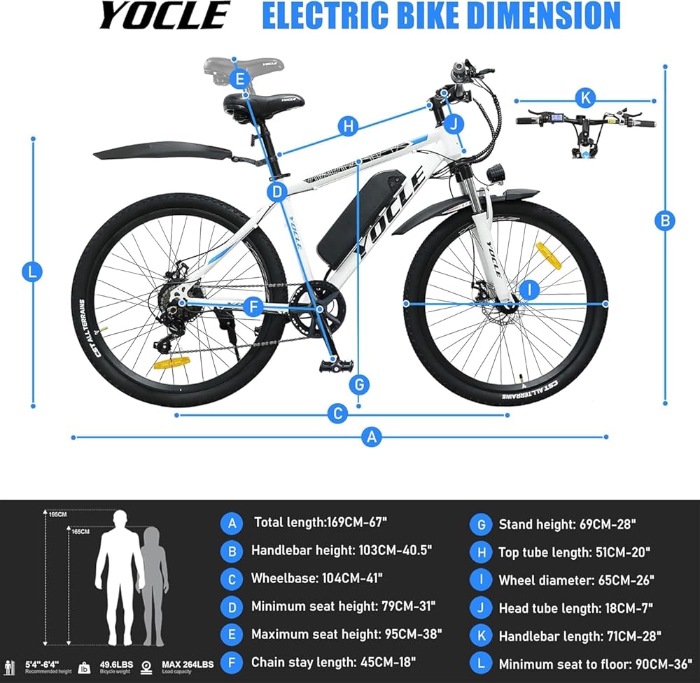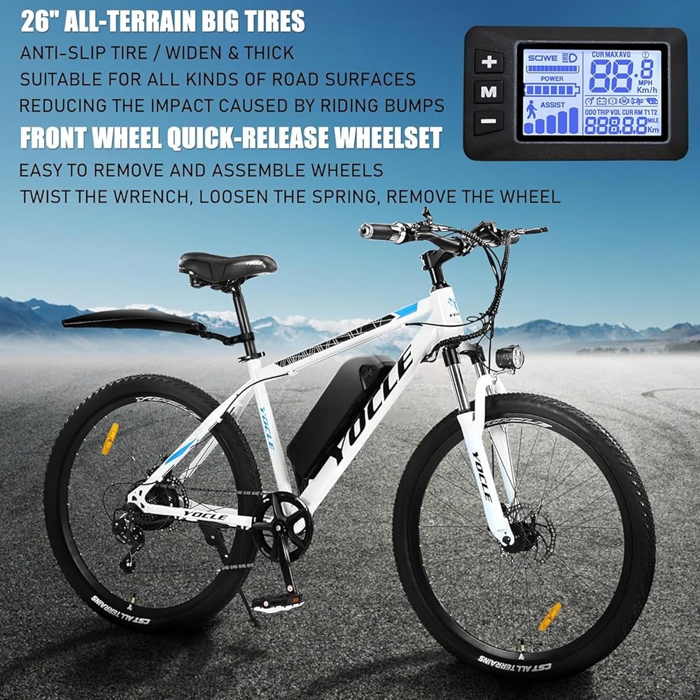 YOCLES 26" Electric Bike for Adults: YOCLES electric bike is equipped with a 350W brushless motor that can reach a top speed of 20 mph. With removeable battery, you can charge whenever you are at home or in the office.YOCLES electric mountain bike has 4 riding modes allows you to ride comfortably.26'' fat tire electric bike adapt to complex road conditions and ensure your safety.Classic look and lightweight makes this electric bike portable, ideal for sports.
