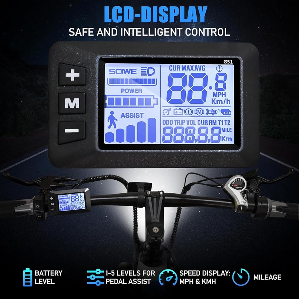 • 🚴【350W Motor & Upgraded Display】 YOCLES electric bike is equipped with a 350W brushless motor that can reach a top speed of 20 mph. The backlight brightness of the LCD display can be adjusted between 1-3 levels. In addition, the upgraded LCD display provides more powerful data support, such as: SCIWE/POWER/ASSIST/CUR MAX AVG/SPEED/ODO/TRIP/VOL/ERROR CODE/WATT/MAINTAIN...