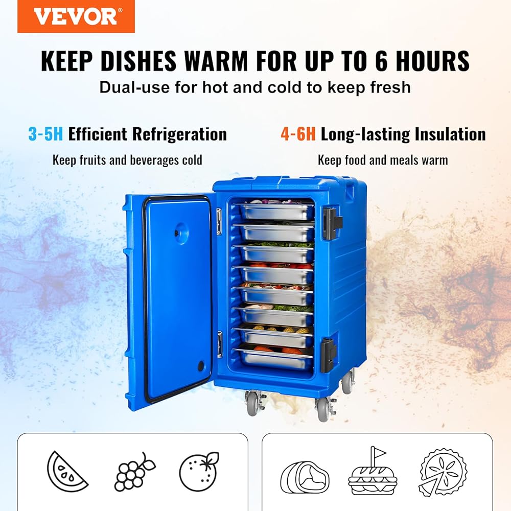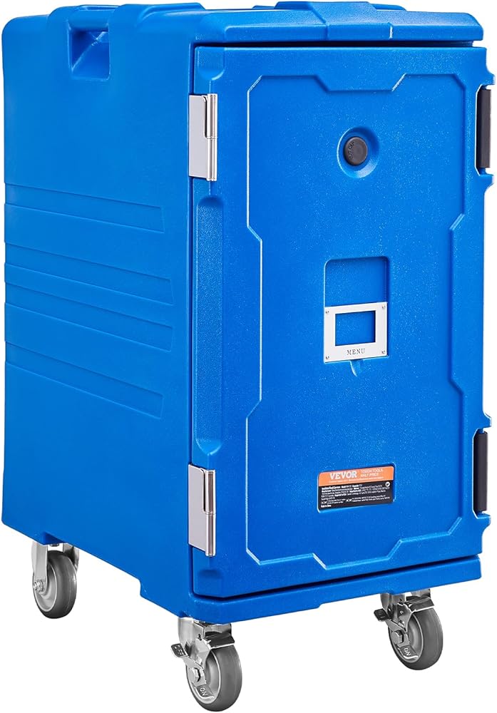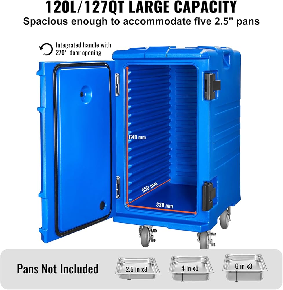 حاملة الطعام المعزولة من VEVOR، صندوق ساخن بسعة 127 لترًا لتقديم الطعام، حاملة علب الطعام مع أبازيم مزدوجة، سخان طعام تحميل أمامي بمقابض، محمل نهائي بعجلات للمطعم والمقصف