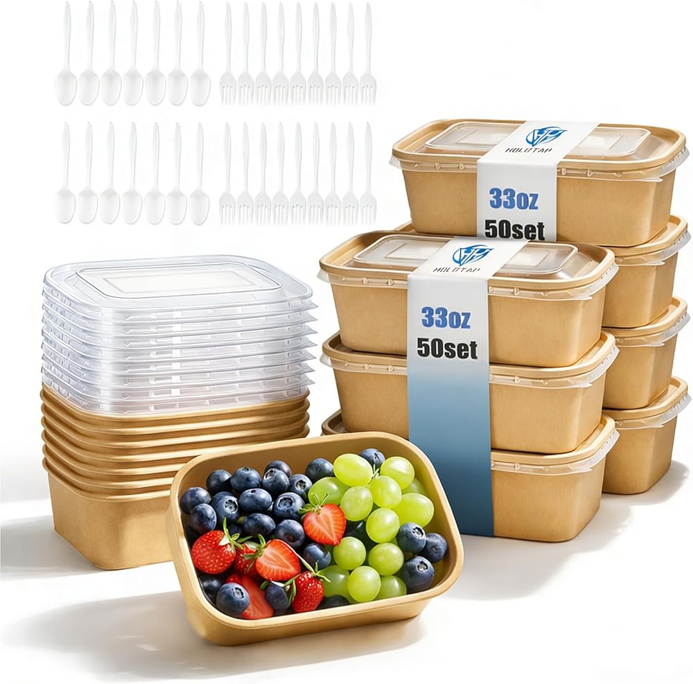 الحجم والسعة: 50 عبوة من ورق الكرافت للذهاب إلى الحاويات ذات الأغطية، والتي تصل سعتها إلى 70 أونصة. يتم تكديسها بشكل أنيق للتخزين موفر للمساحة والاستخدام الفعال خلال الأحداث ذات الحجم الكبير