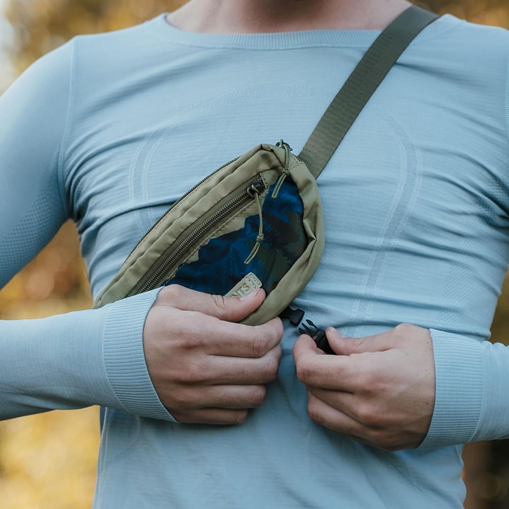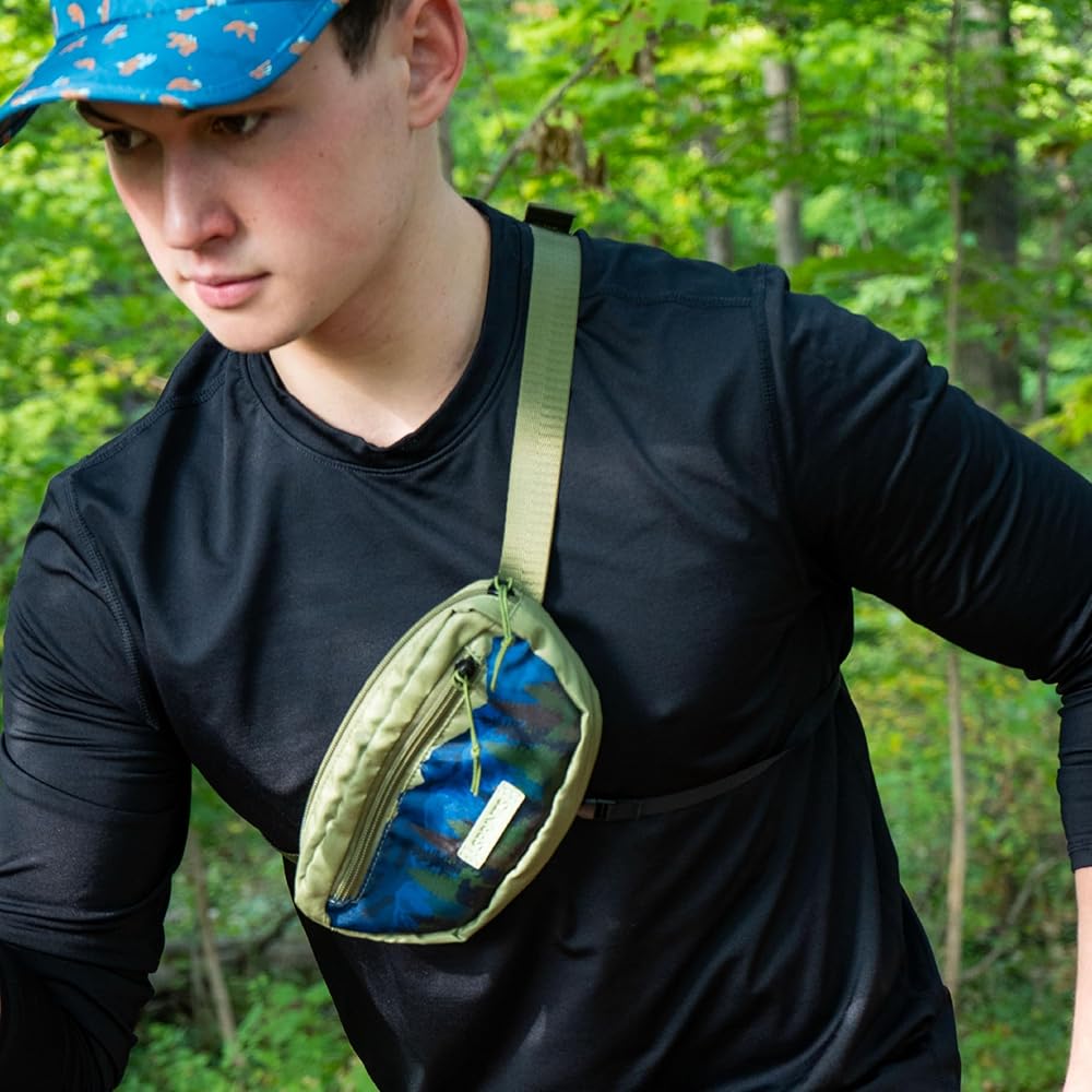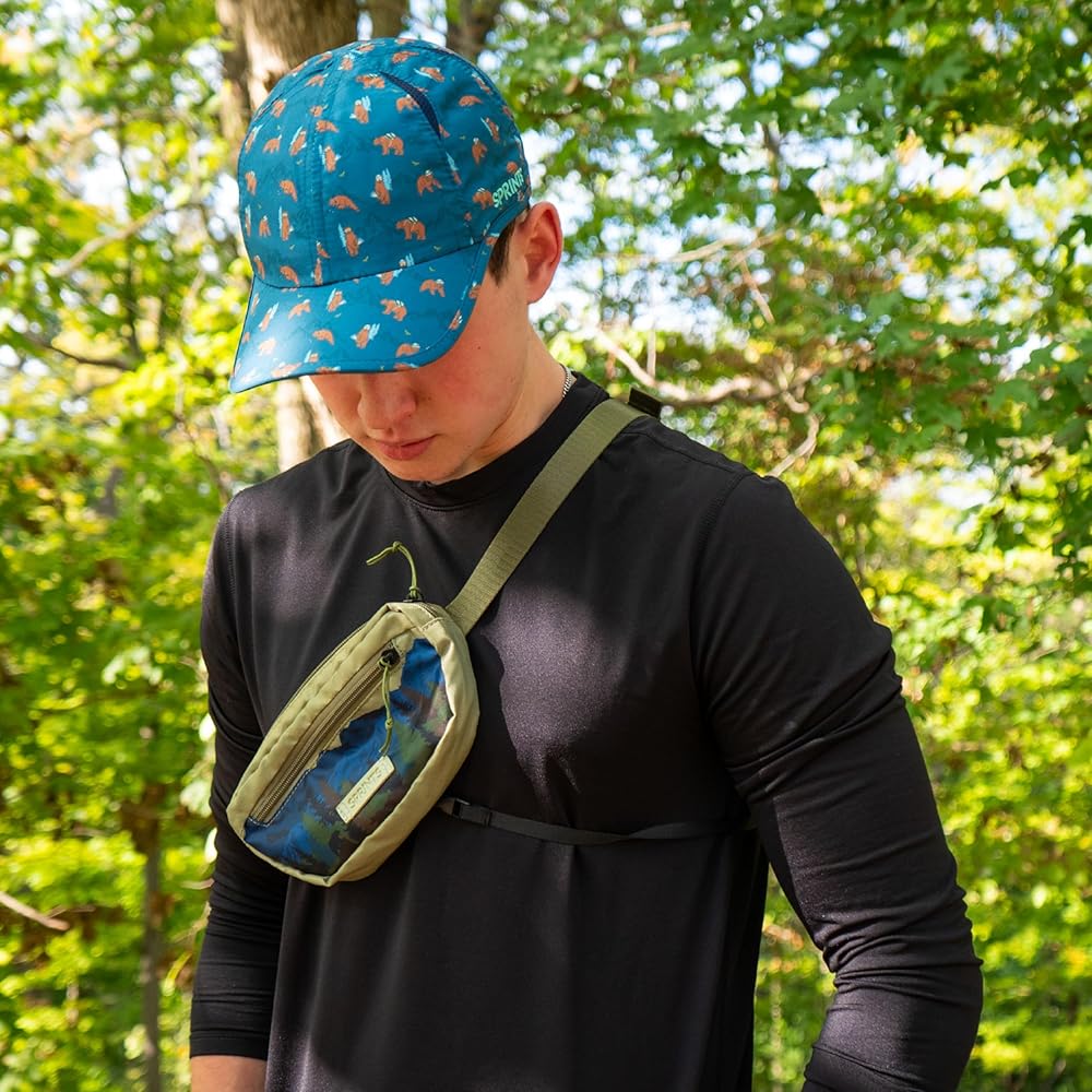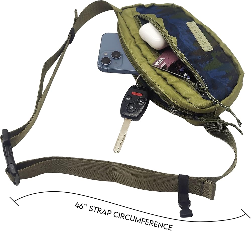 Sprints cross body Sling It bags are here to revolutionize your run. Designed to keep up with your every move, you can say goodbye to annoying bouncing bags and focus on what really matters - rocking your run. At 8” x 4.25” x 1.25” they are the perfect size to fit any iPhone, keys, workout gels, headphones, your wallet, chicken tenders, and more. Two zippered pockets for easy organizing, a removable second strap and a loop for hat storage, so your Sling It isn't lonely. Main strap has an overall circumference of 46". Sayonara Bounce strap is designed to keep the bag snug to your center of gravity so you can enjoy a bounce-less run. The strap can be fully removed or stowed within the bag when not using.