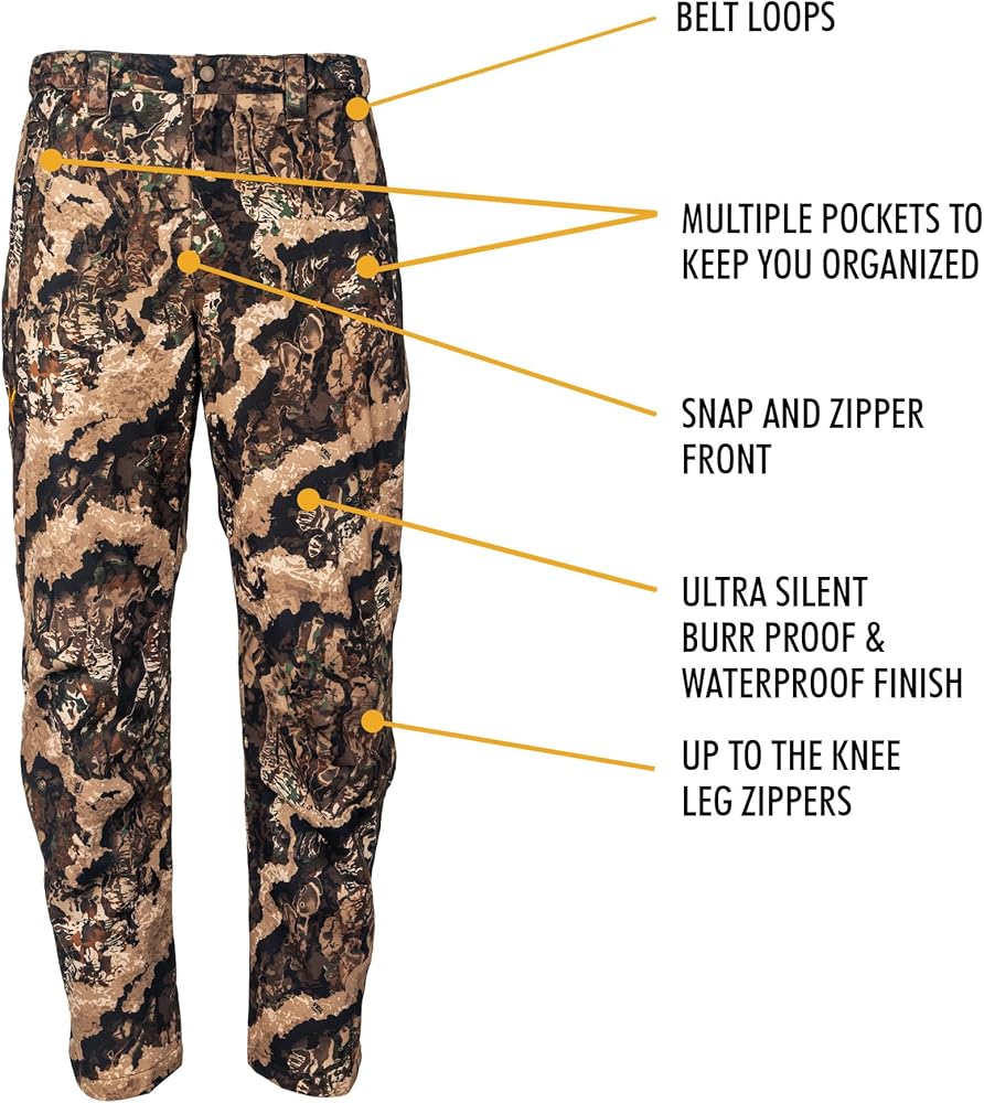ADDITIONAL FEATURES: Belt loops, Multiple pockets, snap and zipper front, Ultra silent burr proof and waterproof fabric, up to the knee leg zippers, elastic waist with rubber grip lining to keep inner layers tucked in