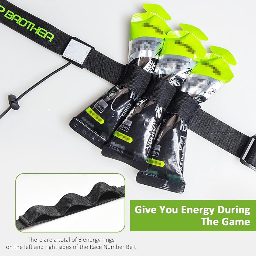 حزام رقم السباق مع 6 حلقات جل: 6 حلقات طعام رياضية. يحتوي كل جانب على حلقات يمكن ربط الأطعمة الرياضية المختلفة بها. حلقات تخزين لألواح الطاقة وحبوب الملح وغيرها من المكملات الغذائية الصغيرة، مما يسمح لك بالحفاظ على طاقتك أثناء التمرين أو المنافسة. قد تكون القدرة على الحصول على إمدادات الطاقة في بعض الأحيان بمثابة تغيير في قواعد اللعبة، خاصة في تحدي المسافات الطويلة.