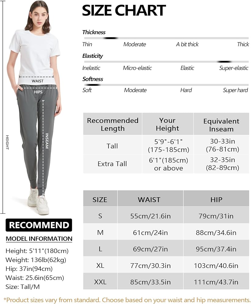 بنطال رياضي صيفي طويل الحجم للنساء: مقاس طويل يناسب الأطوال من 5'9 إلى 6'1 بوصة، وطول إضافي يناسب الأطوال 6'1 بوصة أو أعلى. نوصي بقياس خصرك وأردافك لاختيار المقاس الصحيح. إذا كانت درزة البنطال الداخلية لديك بالقرب من الحد العلوي، نقترح اختيار المقاس الأطول لتغطية أفضل، خاصة أثناء الأنشطة.