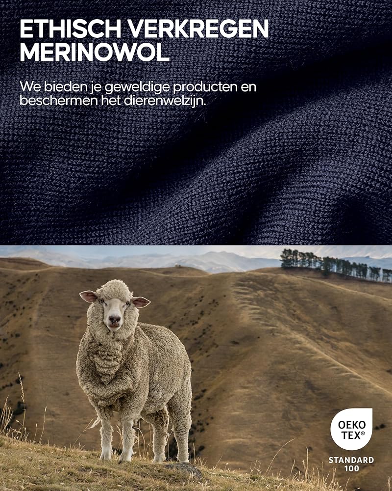مواد فاخرة: مصنوعة من 90% صوف (ميرينو) و10% بولي أميد. معتمد بمعيار OEKO-TEX 100 وخالي من المواد الضارة. يُغسل في الغسالة بحد أقصى. 86 درجة فهرنهايت. لا تجففه بالمجفف