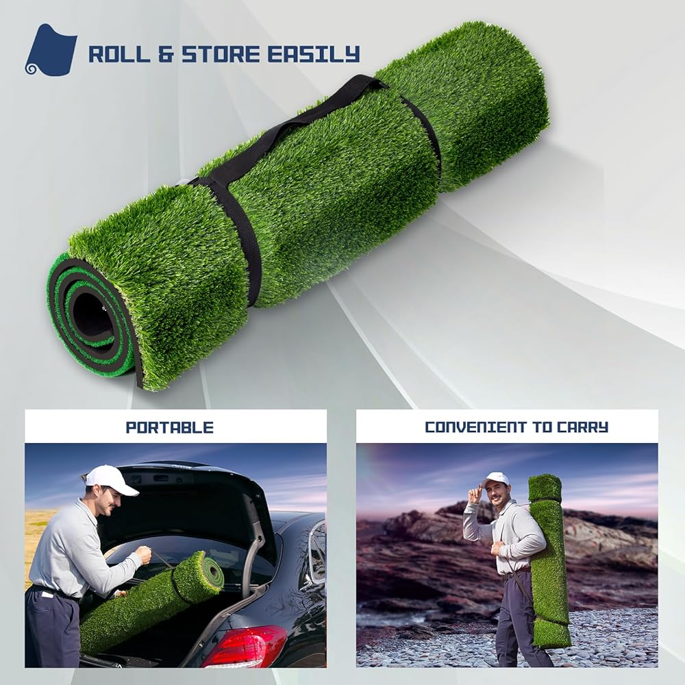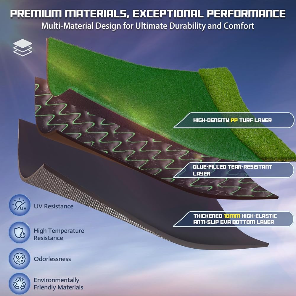 عشب الجولف الفاخر وقاعدة إيفا: تتميز سجادات الجولف هذه بالتمارين الداخلية والخارجية بعشب البولي بروبيلين عالي الكثافة للحصول على تعليقات واقعية؛ يمكن لفها بسهولة من أجل حمل مريح، مما يسمح لك بالتمرين في أي وقت وفي أي مكان؛ توفر قاعدة إيفا عالية الارتداد والمضادة للانزلاق مقاس 8 مم الراحة وتحمي مفاصلك ونواديك، مما يساعدك على رفع مهاراتك دون عناء
