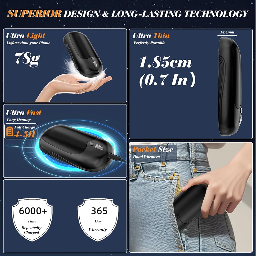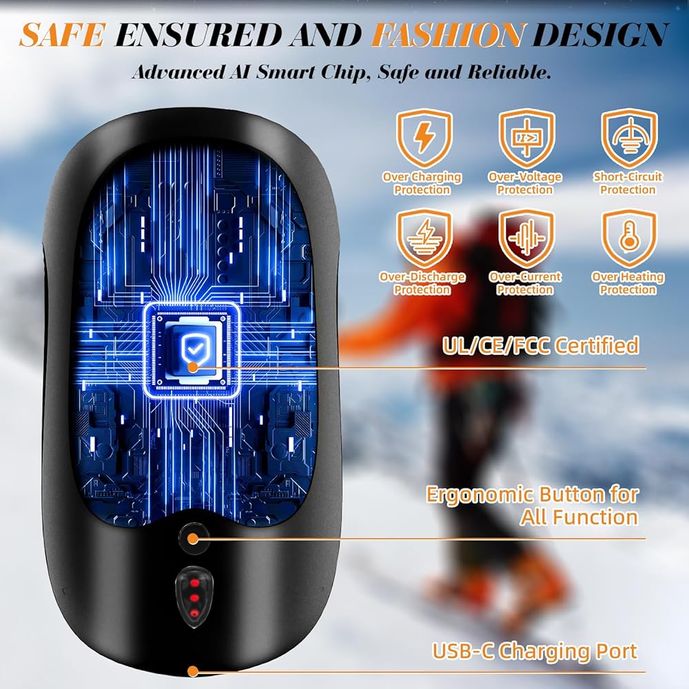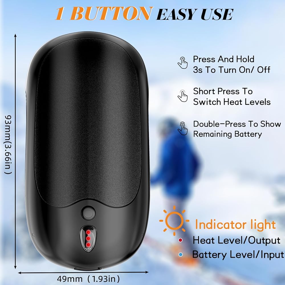 【دفء يدوم لفترة أطول】 مع سعة بطارية كبيرة تبلغ 6000 مللي أمبير في الساعة وأحدث تحكم في شريحة ذكية تعمل بالذكاء الاصطناعي، يوفر لك جهاز تدفئة اليد الكهربائي القابل لإعادة الشحن ما يصل إلى 8-20 ساعة من الدفء خلال الشتاء البارد. فهو يلبي احتياجات يومك بالكامل دون عناء. تبقيك أضواء المؤشر ذات الثلاثة مستويات على اطلاع بشأن طاقة البطارية المتبقية وحالة التسخين، مما يلبي متطلباتك المتنوعة بشكل مثالي. يمكن لكابل الشحن من النوع C المتضمن شحن جهاز تدفئة اليد بسرعة.