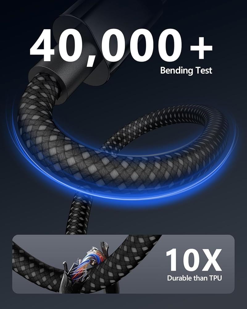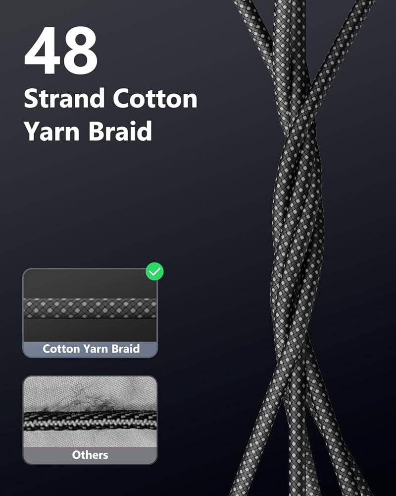 • 【كابل USB-C مزدوج الأطراف】هذا هو كابل USB-C إلى USB-C. وليس كابل USB-C إلى USB-A. كابلات USB-C مصنوعة من 48 خيطًا قطنيًا مضفرًا، أقل عرضة للتشابك والتلف، مما يجعلها أكثر متانة ومرونة، ويمكنها تحمل ما يصل إلى 20000 انحناء.