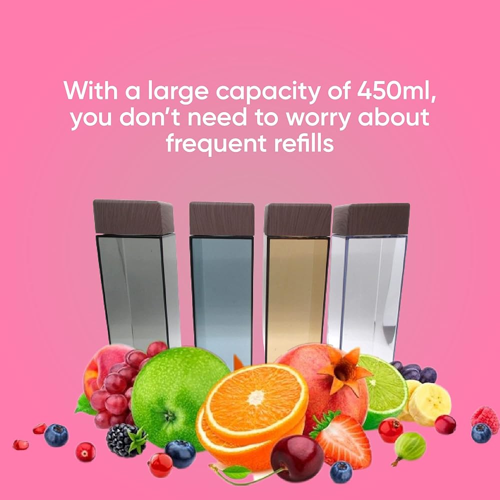سعة كبيرة: بسعة كبيرة تبلغ 450 مل، فإن زجاجات العصير الفردية الخاصة بنا تلغي الحاجة إلى إعادة التعبئة بشكل متكرر، مما يضمن الاستمتاع بمشروبك المفضل دون انقطاع.