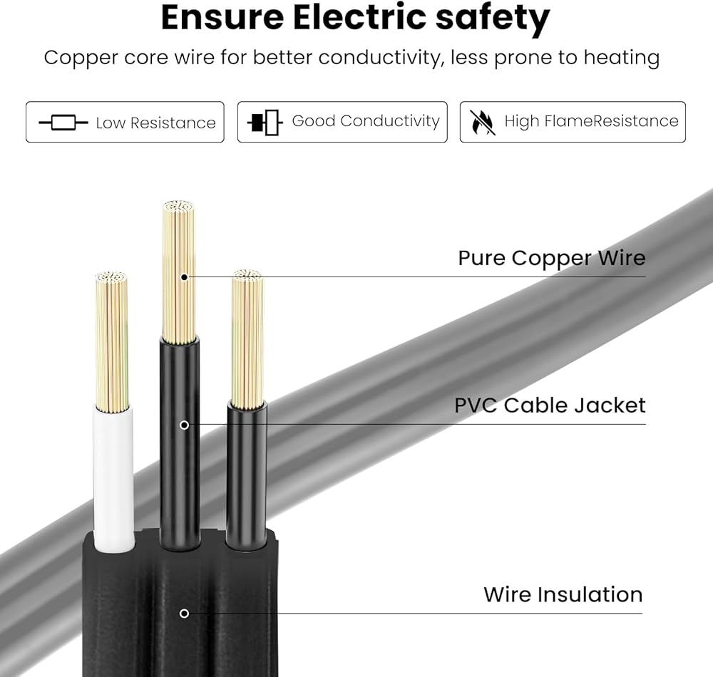 أداء ممتاز للمنتج: مصنوع من النحاس وغلاف الفينيل السميك الذي يلبي المعايير الدولية، ويتميز بمقاومة منخفضة، وفقدان نقل الطاقة المنخفض، ومقاومة الرطوبة، ومقاومة التآكل، ومثبطات اللهب، ومقاومة الانزلاق. يزيد القابس المؤرض ثلاثي الشوكات من السلامة والأمان والمتانة، ويتمتع بمرونة جيدة لسهولة التخزين.