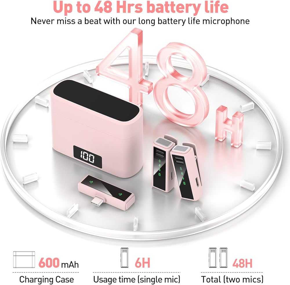 [بطارية 12 ساعة ونطاق 100 قدم]: توفر ميكروفونات أندرويد عمر بطارية مثير للإعجاب لمدة 12 ساعة (6 ساعات لميكروفون واحد)، مما يضمن تسجيل صوتي عالي الجودة دون انقطاع على مدى فترات طويلة. نطاق 100 قدم يسمح بحركة غير مقيدة دون فقدان الاتصال، مما يتيح التقاط كل التفاصيل بصوت بجودة الاستوديو