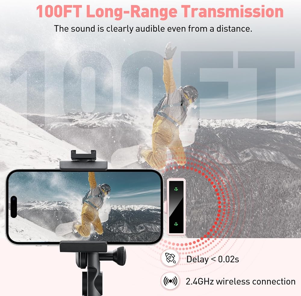 [2.4 جيجا هرتز والتشغيل بالقابس]: تستخدم الميكروفونات اللاسلكية أحدث التقنيات اللاسلكية 2.4 جيجا هرتز من أجل زمن وصول منخفض للغاية. لا يلزم وجود برامج إضافية أو اقتران بلوتوث. ما عليك سوى توصيل جهازك والاستمتاع بتسجيل صوتي عالي الجودة دون عناء
