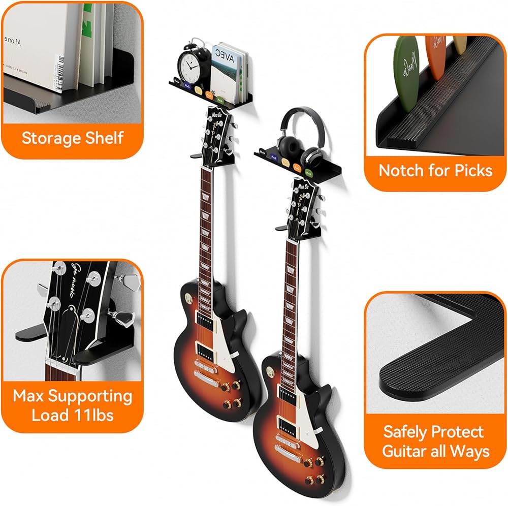 تصميم مريح لفتحة الاختيار: توفر فتحة الاختيار المدمجة سهولة الوصول إلى اختياراتك مع الحفاظ على المساحة مرتبة. جنبًا إلى جنب مع رف الحائط لملحقات الجيتار، فهو يضمن أن كل ما تحتاجه قريب من متناول اليد ومنظم بشكل أنيق، مما يتجنب الفوضى غير الضرورية.