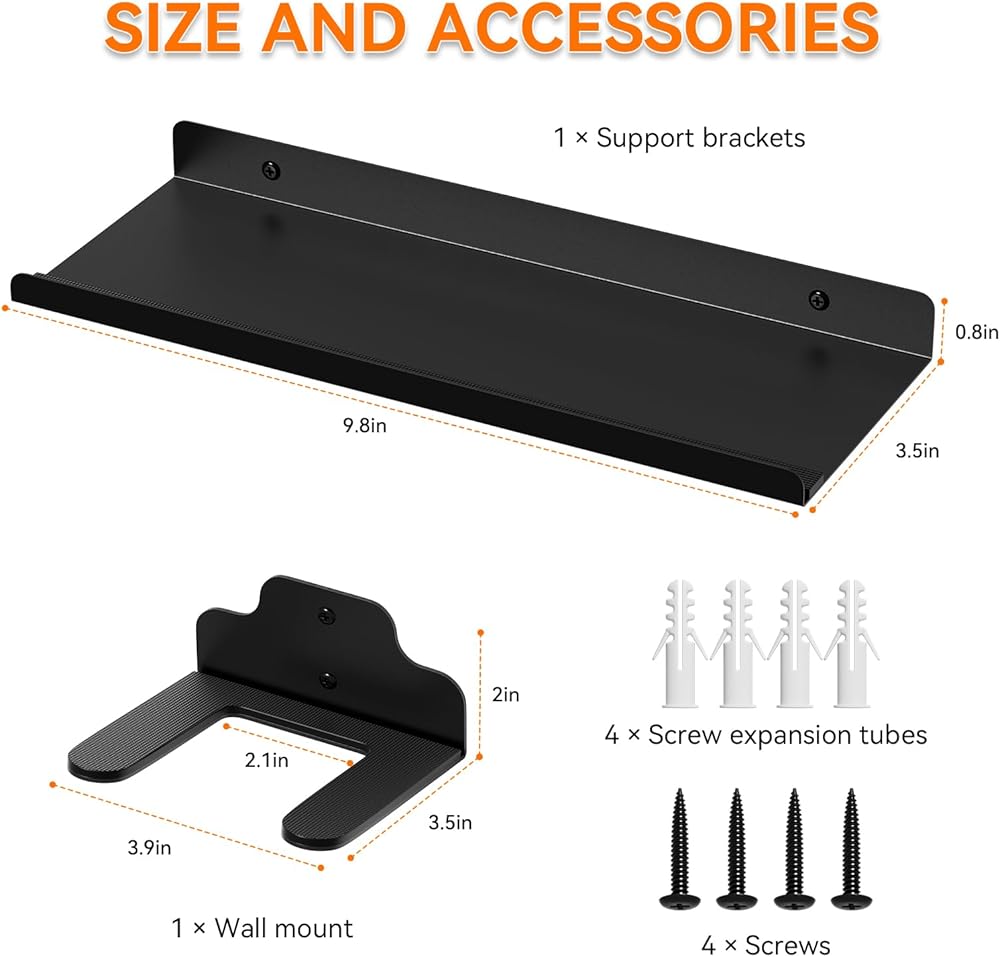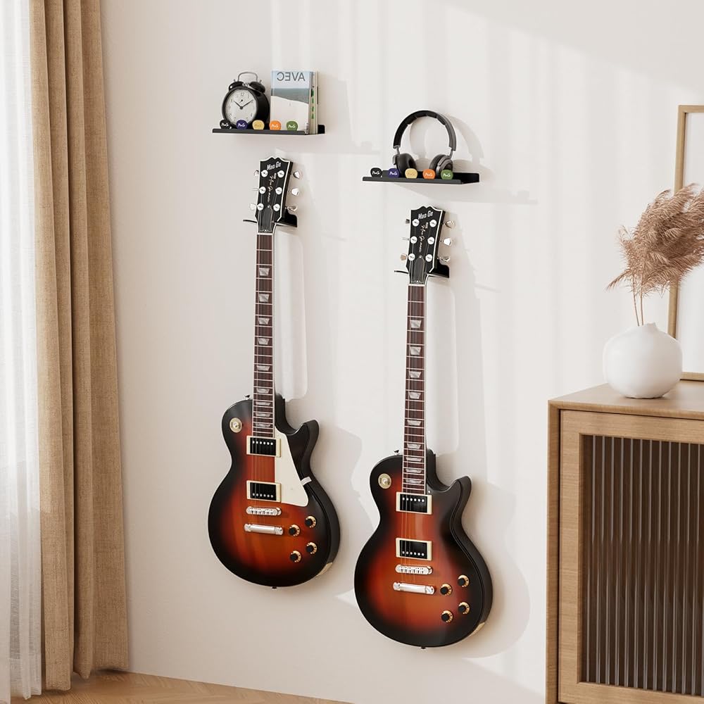 رف الملحقات الموفر للمساحة: يوفر رف الحائط لملحقات الجيتار مساحة تخزين إضافية للعناصر الأساسية مثل الموالفات والكابو والأشرطة أو الأشياء الزخرفية. يساعدك على الحفاظ على المساحة الخاصة بك منظمة مع تعزيز الجمالية الشاملة لمنطقة الموسيقى الخاصة بك