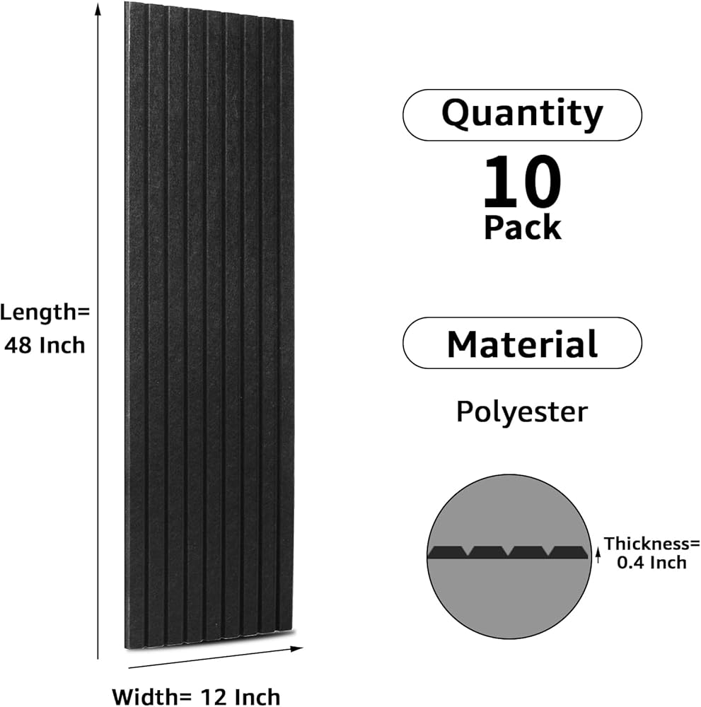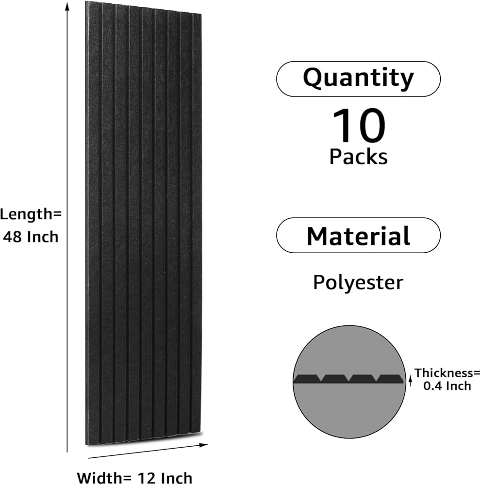 Art3dwallpanels 10 لوحات صوتية، 48 بوصة × 12 بوصة × 0.35 بوصة لوحات حائط عازلة للصوت، معالجة صوتية ذاتية اللصق عالية الكثافة ممتصة للصوت لاستوديو التسجيل، المكتب، أسود