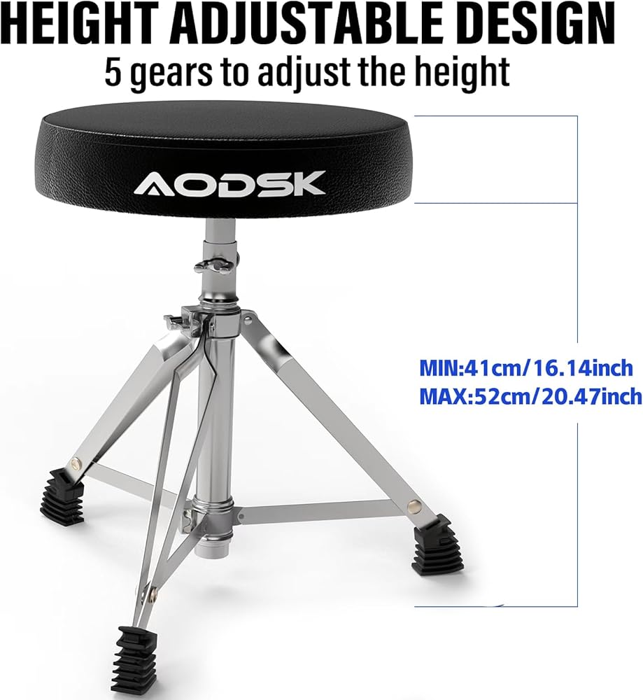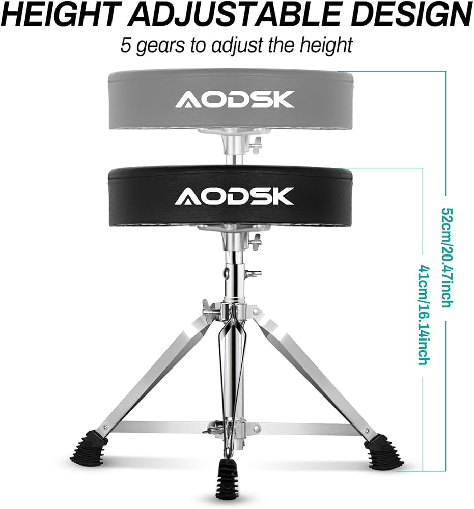 [ارتفاع قابل للتعديل]: يمكنك ضبط الارتفاع عن طريق ضبط قفل المسمار ذو 5 أوضاع أو المقبض في الأسفل. يمكن تعديل ارتفاع مقعد الطبل من 16.14 بوصة الحد الأدنى للارتفاع إلى 20.47 بوصة أقصى ارتفاع، وهو مناسب للأطفال، المراهقين أو البالغين