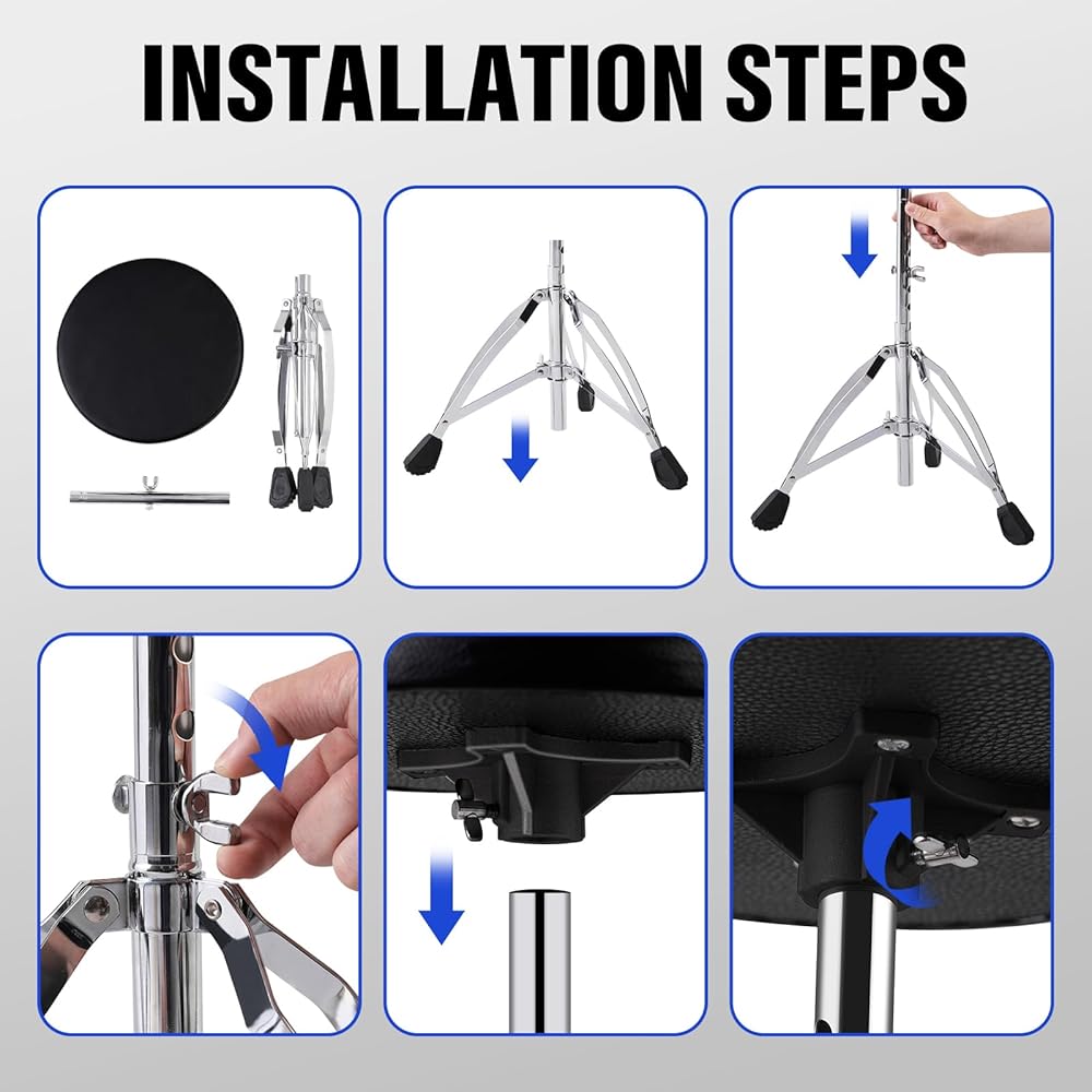 [سهلة التجميع]: تتضمن قائمة التجميع 3 أجزاء - 1 وسادة مقعد الطبل، 1 ساق مقعد، 1 دعم. تحتاج فقط إلى بضع دقائق لتجميع عرش الطبل هذا. يوجد دعمان متقاطعان في الجزء السفلي من قاعدة الطبل، ويوجد 4 هياكل تثبيت لولبية، بحيث يتمتع هذا المقعد بدعم كافٍ ويمكنه تحمل وزن يصل إلى 250 رطلاً على الأقل