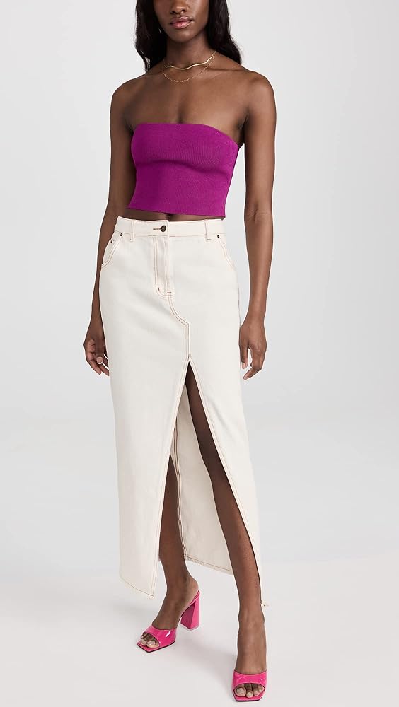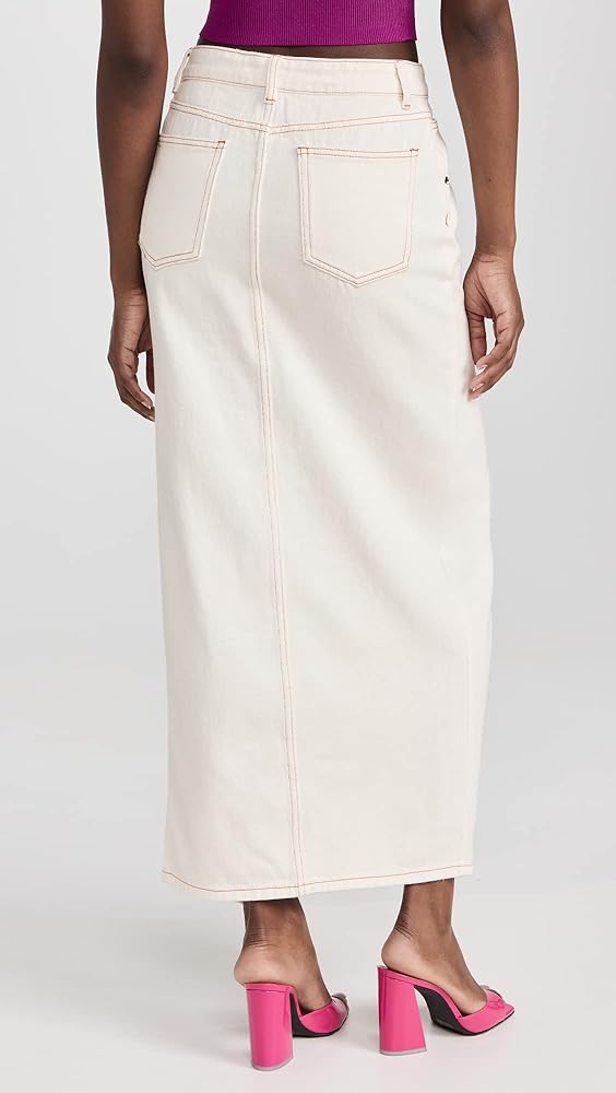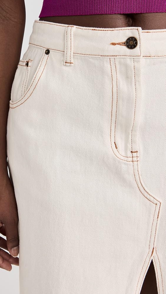 Sturdy, midnight-dark denim with classic contrast stitching composes this Lioness midi skirt, which gains a relaxed fit and eye-catching look from a thigh-high front slit.