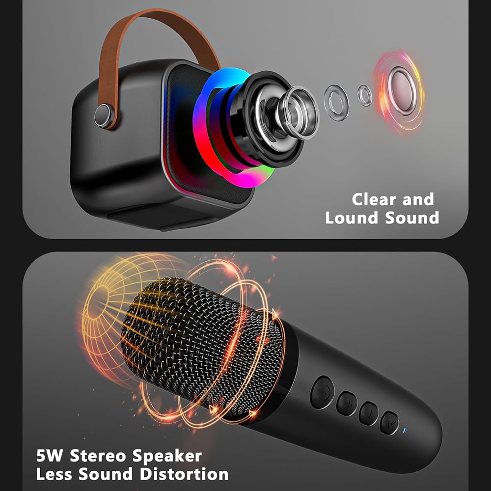 【أداء صوت رائع】تم تجهيز جهاز الكاريوكي الصغير هذا المزود بميكروفونين لاسلكيين بمحركات صوت عالية الأداء ومعالجات إشارة رقمية متقدمة، مما يوفر صوتًا قويًا ومتوازنًا بأقل قدر من التشويه. إنها لعبة ممتعة لجميع أفراد الأسرة للعب معًا. إنها أيضًا هدايا مثالية للفتيات والأولاد لإطلاق العنان لمواهبهم الغنائية أو التحدث.