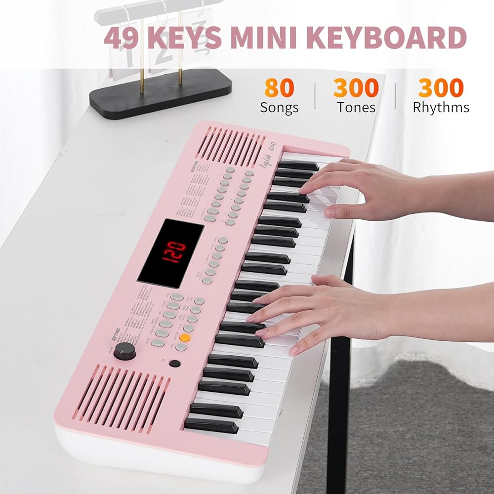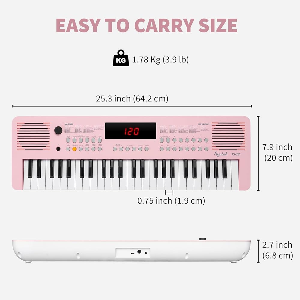 صغير الحجم ومحمول: يحتوي على 49 مفتاحًا صغيرًا، مناسب للأطفال والمراهقين ذوي الأصابع الصغيرة. لوحة المفاتيح الكهربائية الصغيرة مدمجة الحجم (25.3x7.9x2.7 بوصة) وخفيفة الوزن (3.9 رطل)، مما يسهل حملها معك للارتجال، وهي مناسبة جدًا للرحلات القصيرة والتجمعات العائلية