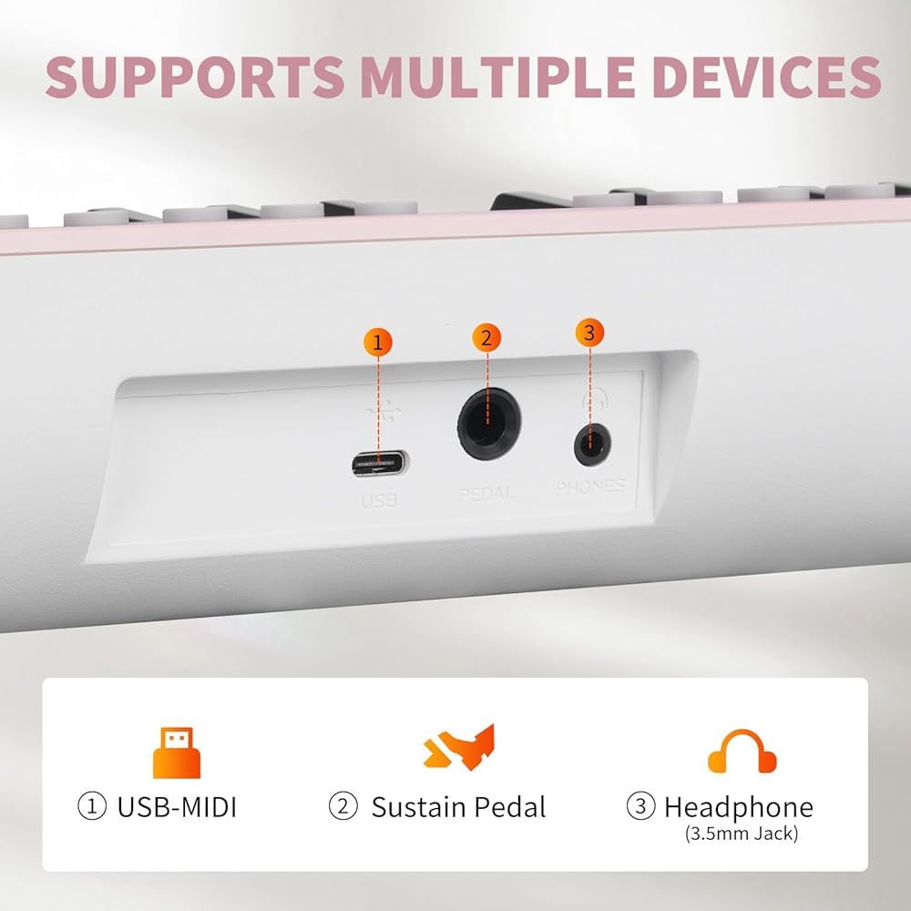 لوحة مفاتيح متعددة الوظائف: يأتي بيانو لوحة المفاتيح هذا مع مقبس سماعة الرأس (3.5 مم)، ومقبس الدواسة، ويدعم USB MIDI (يدعم فقط ملاحظات MIDI، ولا يمكنه إخراج رسائل MIDI CC)، والتحكم في مستوى الصوت. كما أنها تحتوي على شاشة LED تعرض البيانات المختلفة التي تقوم بتعديلها في الوقت الفعلي. إنها لوحة مفاتيح موسيقية عملية للغاية، وليست مجرد لعبة