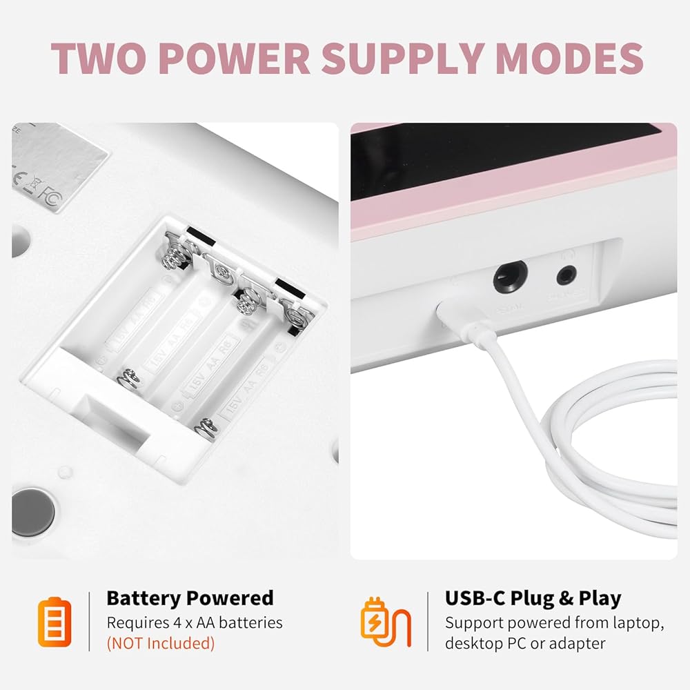 طريقتان لإمداد الطاقة: يمكن تشغيل لوحة المفاتيح المحمولة بالبطاريات، وتتطلب 4 بطاريات AA (ملاحظة: المجموعة لا تتضمن البطاريات). بالإضافة إلى ذلك، يمكن أيضًا تشغيله عن طريق USB والتوصيل والتشغيل