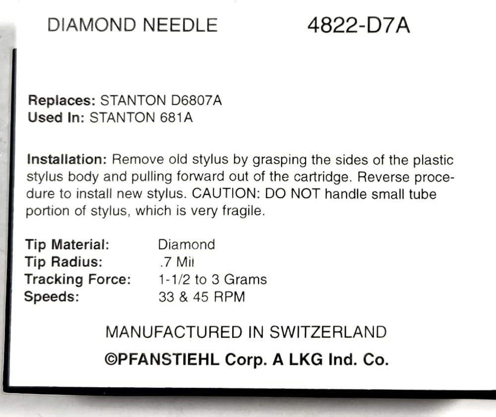 Replaces the following Stanton needles: D6800AL, D6800SL, D6807A, D6807A. Used in: Stanton 680 Series, Stanton 681EE, Stanton 681EEE and all 681 Stanton 681 Calibration Series; Stanton 678SE 681EE E721E 722EE 80XE 81EE 88S 8888SS 88EE 91SS 999SH HT300EEE HT400S PRO45 PRO95 SPS65 SS2D2 STUDIO EEE Used in the following cartridges: STANTON 681A 681AL