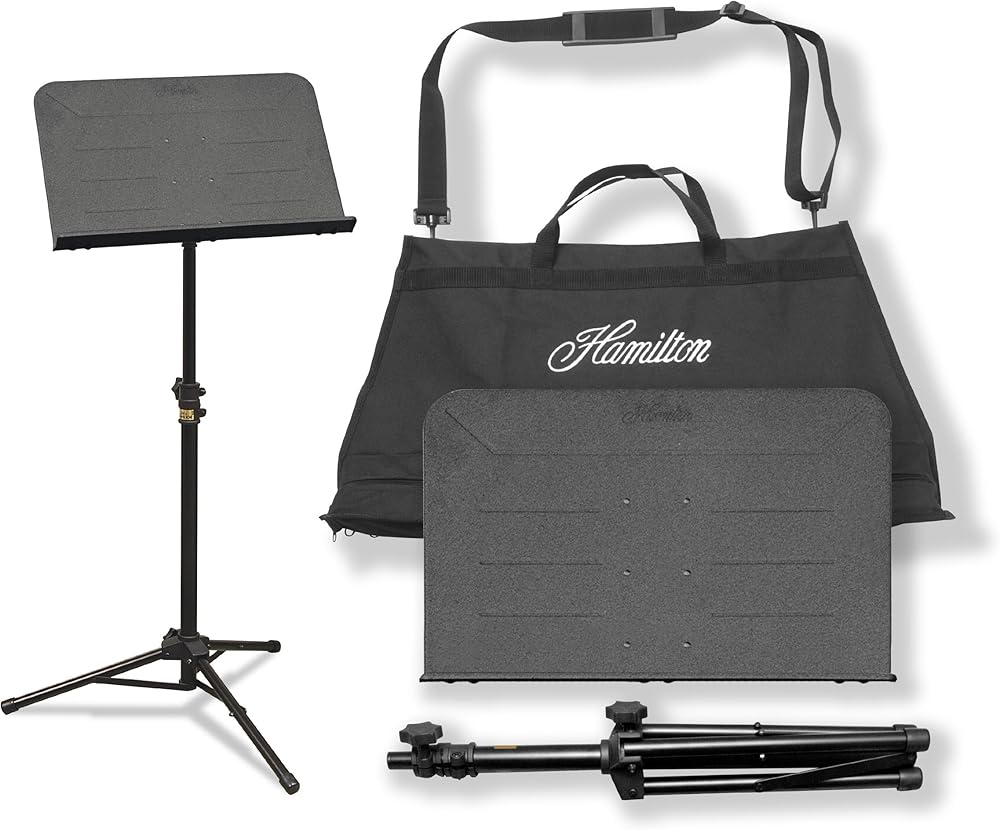 Ideal for the gigging musician! Features Hamilton's exclusive all steel desk with rolled edges to resist bending, reinforcing ribs on the desk face and gussets in the corner of the shelf Knob adjustment for height, desk angle and leg position The adjusts from 26 to 47 1/2 inches in height The bag is made from heavy duty Cardura type cloth and includes two zippered compartments, one for the desk and another for the base Durable powder coated finish