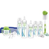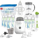Everything you need for Happy Feeding! Dr. Brown's Natural Flow® Anti-Colic Options+™ All-In-One Gift Set has mom and baby covered from soothing to feeding to bottle cleaning. The anti-colic internal vent system is clinically proven to reduce colic. Dr. Brown's bottles provide a more comfortable feeding experience for baby by decreasing spit-up, burping and gas. This vacuum-free feeding is closest to breastfeeding and Dr. Brown's silicone nipples provide a consistent flow so baby can feed at their own pace. The breast-like nipple shape encourages a proper latch for a more natural bottle feeding experience and eases the transition from breast to bottle and back again. Dr. Brown's vent system is proven to help preserve bottle milk nutrients and aids in digestion for a better night's sleep. The silicone nipple, together with the internal vent system, offer a reliable and trusted bottle feeding experience that makes Dr. Brown's the #1 Pediatrician Recommended Baby Bottle in the U.S.* Made to grow with baby, our bottle is designed to nourish through all of baby's feeding stages and is recyclable. Safe for use in dishwasher (top rack only), electric and microwave sterilizers or boiling water. BPA Free. *IQVIA Health ProVoice Survey 2022