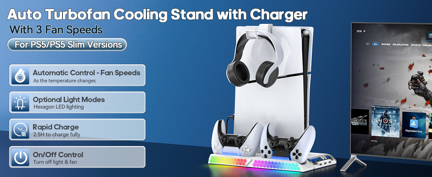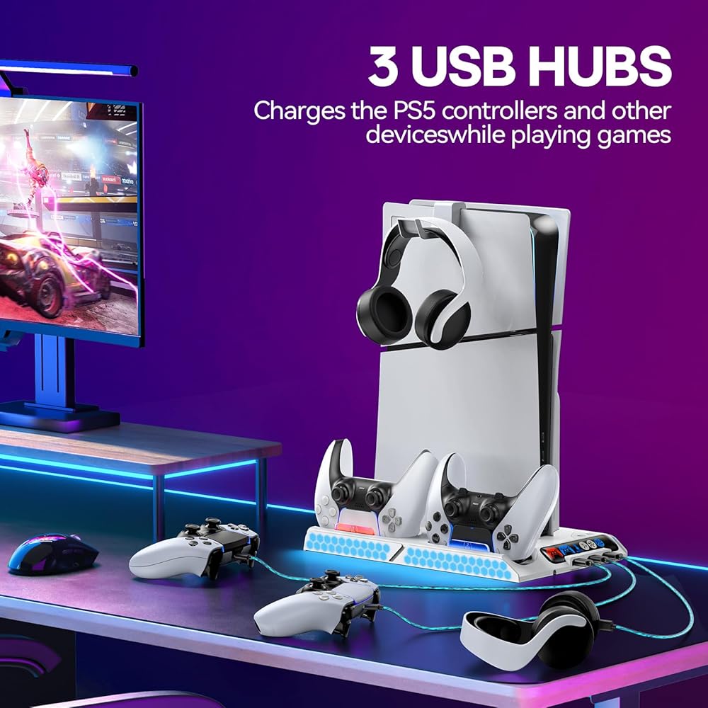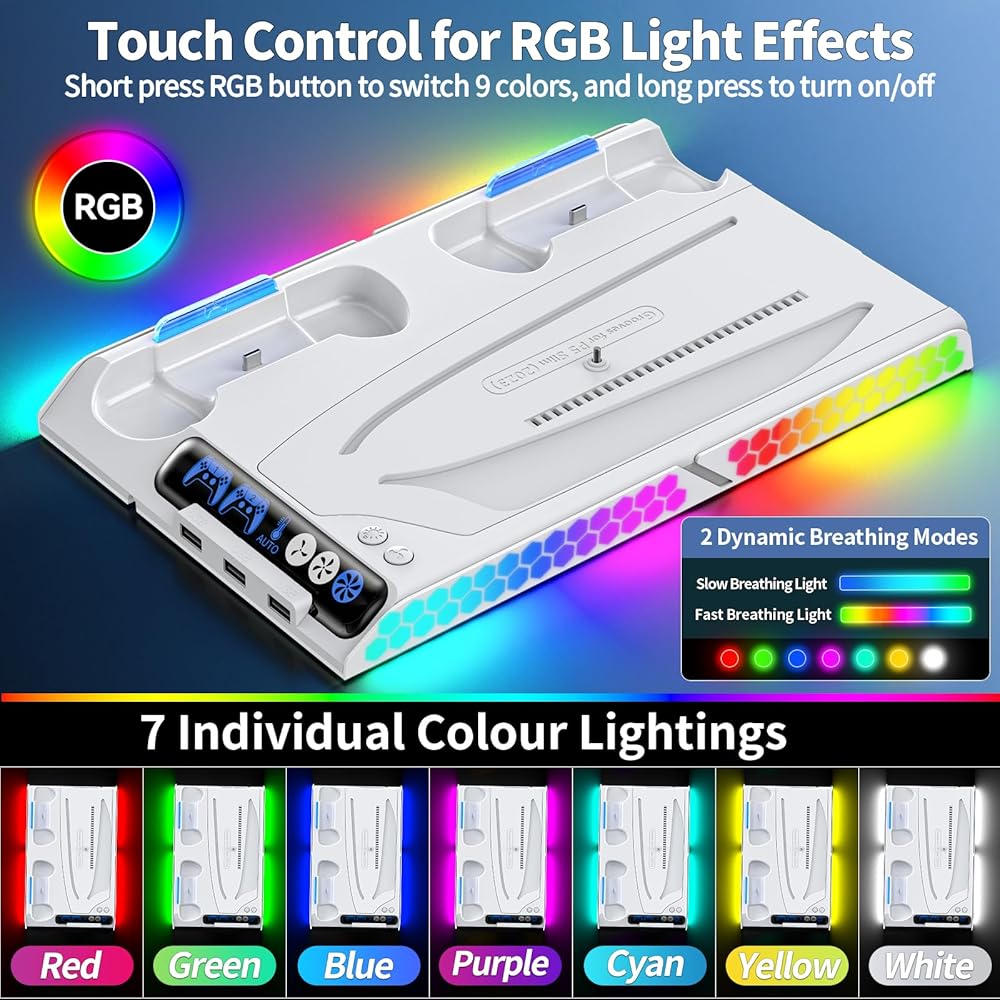 محطة تبريد PS5 Slim/PS5 مع سرعة مروحة تلقائية عن طريق التحكم في درجة الحرارة، محطة إرساء عمودية لـ PS5 مع مروحة تبريد بأربعة مستويات وRGB، ملحقات PS5 مع شاحن وحدة تحكم للأصل/الحافة و3 محاور USB