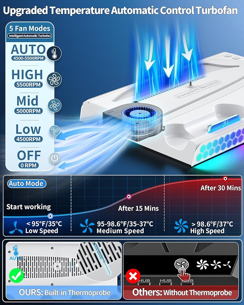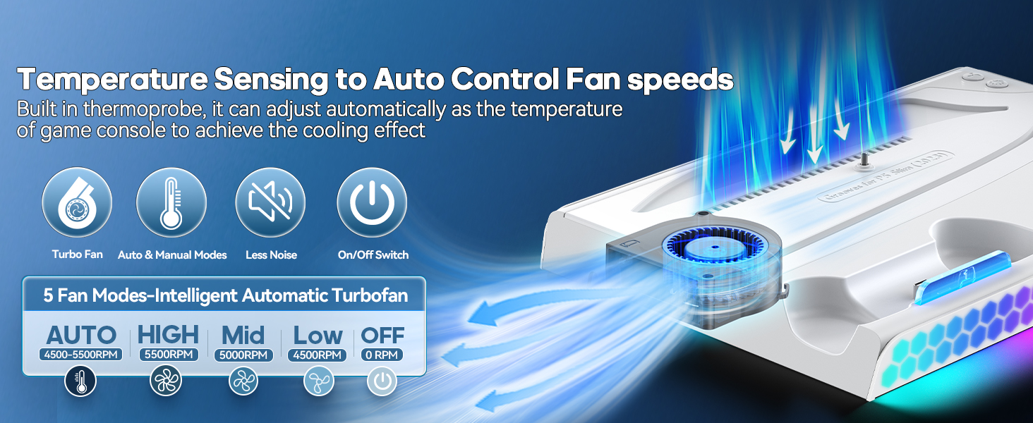 • سرعات المروحة مع استشعار درجة الحرارة - يحتوي حامل PS5 الرائع على 3 سرعات تبريد تتوافق تلقائيًا مع درجات الحرارة المختلفة. مسبار درجة الحرارة المدمج، يمكن لمروحة التبريد PS5 استشعار درجة الحرارة تلقائيًا لضبط سرعة المروحة عندما تكون في الوضع التلقائي. (عندما تكون درجة الحرارة أقل من 95 درجة فهرنهايت/35 درجة مئوية، فسوف تتوافق مع سرعة المروحة المنخفضة، بشكل مماثل بين 95 درجة فهرنهايت/35 درجة مئوية إلى 100 درجة فهرنهايت/38 درجة مئوية للسرعة المتوسطة، أعلى من 100 درجة فهرنهايت/38 درجة مئوية للسرعة العالية). بالنسبة للوضع اليدوي، تحتوي مروحة تبريد مروحة PS5 على زر تبديل المروحة لضبط 3 مستويات للسرعة (عالية ومتوسطة ومنخفضة). بفضل وظيفة الذاكرة، يمكن لـ PS5 Cooler الاحتفاظ بآخر سرعة مستخدمة للمروحة عند إعادة التشغيل. يعد حامل PS5 النحيف هو الفائز المطلق لعشاق ألعاب PS5.