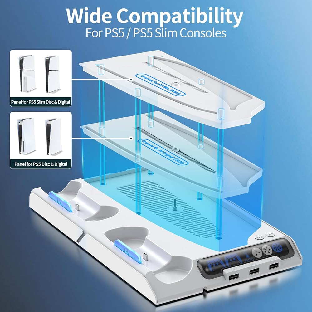 • ملاحظة: غير مناسب لوحدة تحكم PS5 PRO. محطة إرساء PS5 متوافقة مع وحدة التحكم الرقمية والأقراص 2023 PS5 Slim و2020 PS5. مناسب لجهاز تحكم PS5 وEdge.